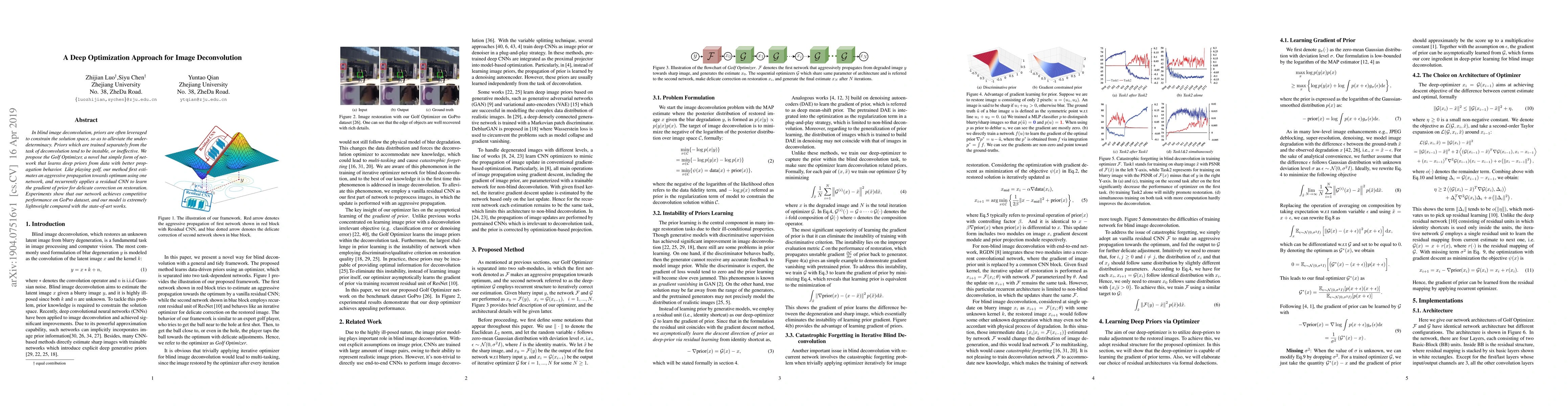 In blind image deconvolution, priors are often leveraged to constrain the solution space, so as to alleviate the under-determinacy. Priors which are trained separately from the task of deconvolution tend to be instable, or ineffective. We propose the Golf Optimizer, a novel but simple form of network that learns deep priors from data with better propagation behavior. Like playing golf, our method first estimates an aggressive propagation towards optimum using one network, and recurrently applies a residual CNN to learn the gradient of prior for delicate correction on restoration. Experiments show that our network achieves competitive performance on GoPro dataset, and our model is extremely lightweight compared with the state-of-art works.