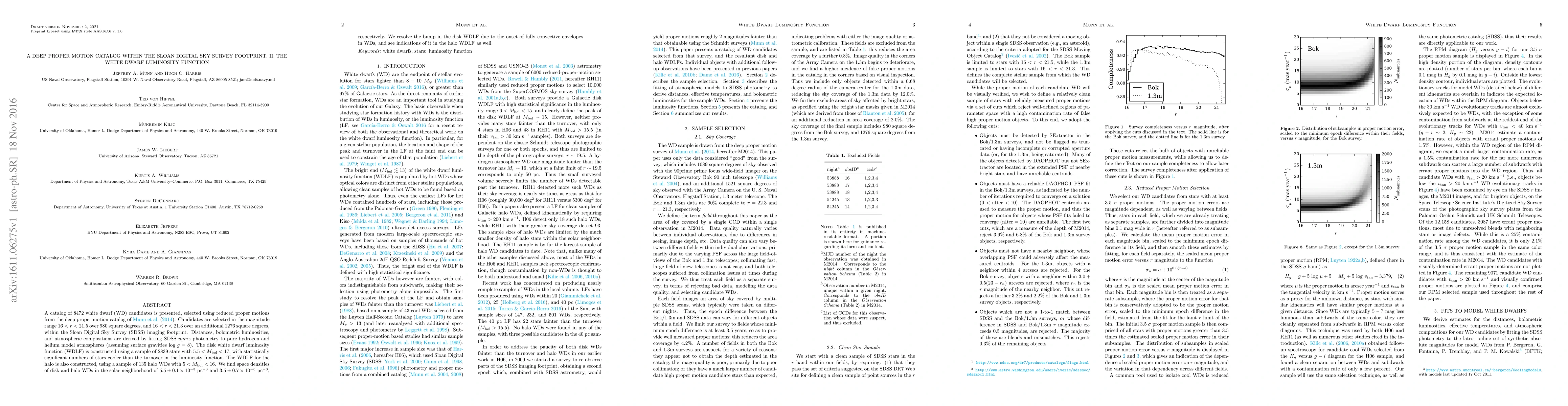 A catalog of 8472 white dwarf (WD) candidates is presented, selected using reduced proper motions from the deep proper motion catalog of Munn et al. 2014. Candidates are selected in the magnitude range 16 < r < 21.5 over 980 square degrees, and 16 < r < 21.3 over an additional 1276 square degrees, within the Sloan Digital Sky Survey (SDSS) imaging footprint. Distances, bolometric luminosities, and atmospheric compositions are derived by fitting SDSS ugriz photometry to pure hydrogen and helium model atmospheres (assuming surface gravities log g = 8). The disk white dwarf luminosity function (WDLF) is constructed using a sample of 2839 stars with 5.5 < M_bol < 17, with statistically significant numbers of stars cooler than the turnover in the luminosity function. The WDLF for the halo is also constructed, using a sample of 135 halo WDs with 5 < M_bol < 16. We find space densities of disk and halo WDs in the solar neighborhood of 5.5 +- 0.1 x 10^-3 pc^-3 and 3.5 +- 0.7 x 10^-5 pc^-3, respectively. We resolve the bump in the disk WDLF due to the onset of fully convective envelopes in WDs, and see indications of it in the halo WDLF as well.