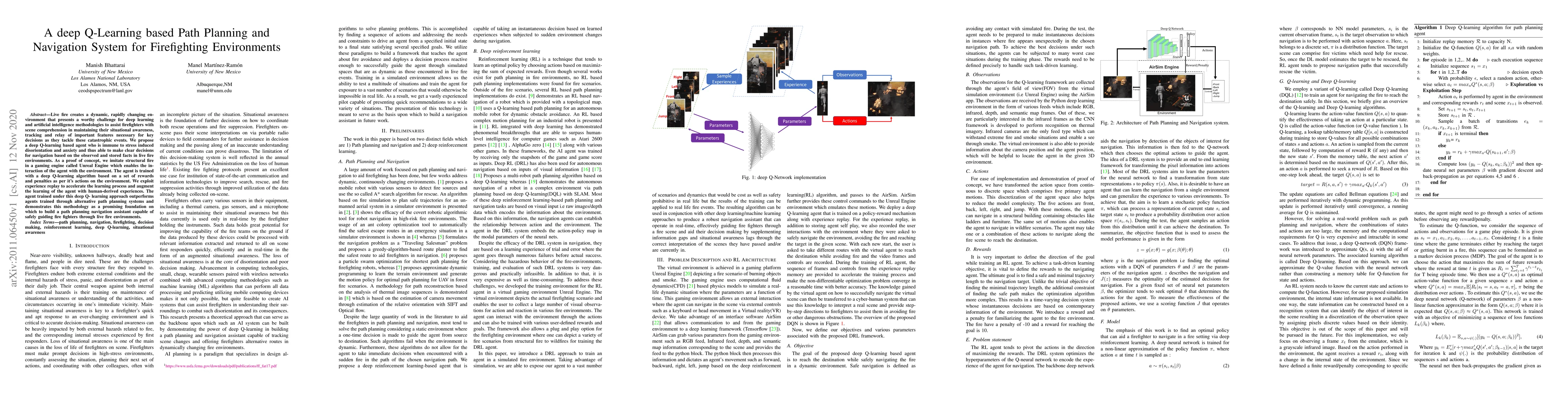 This paper proposes a deep Q-learning based navigation system to assist firefighters in dynamic, live fire environments. The agent trained in Unreal Engine demonstrates superior path planning capabilities compared to alternative methods, showcasing potential for real-world firefighting applications.