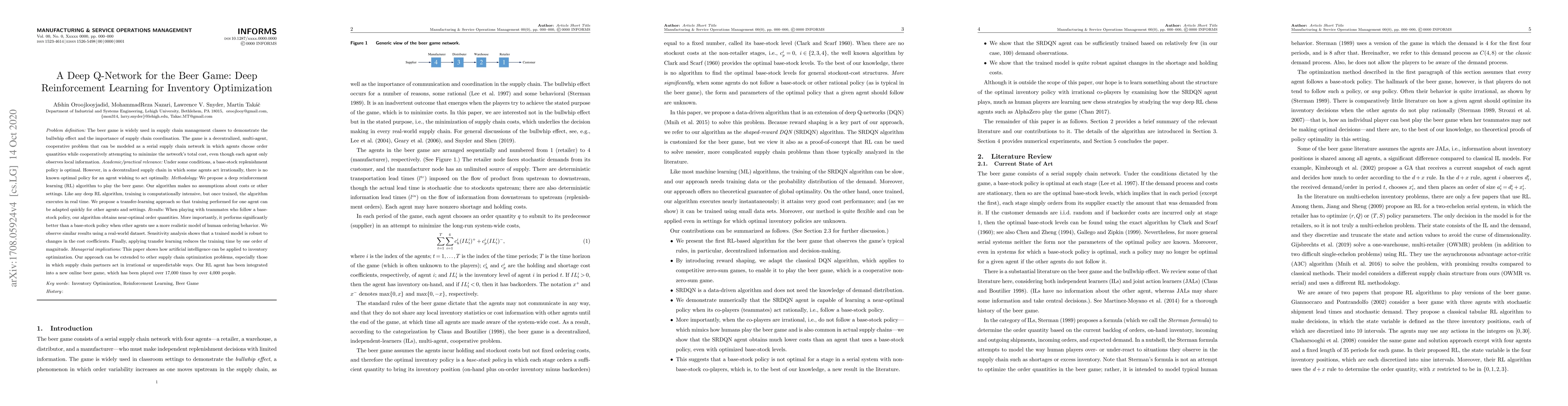 This paper proposes a deep Q-network algorithm to optimize replenishment decisions in the Beer Game, a supply chain management simulation. The algorithm outperforms traditional base-stock policies, especially when other agents exhibit more realistic human behavior, and can be adapted via transfer learning for different agents and costs.