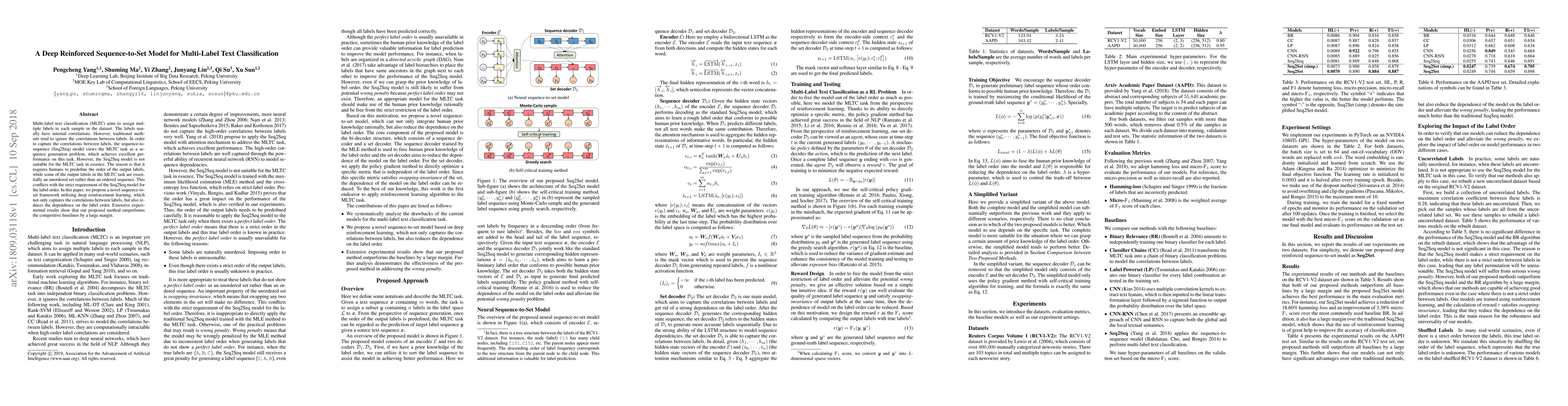 The paper proposes a deep reinforced sequence-to-set model to address multi-label text classification by capturing label correlations without requiring predefined label order, outperforming traditional sequence-to-sequence models and baselines in experiments.
