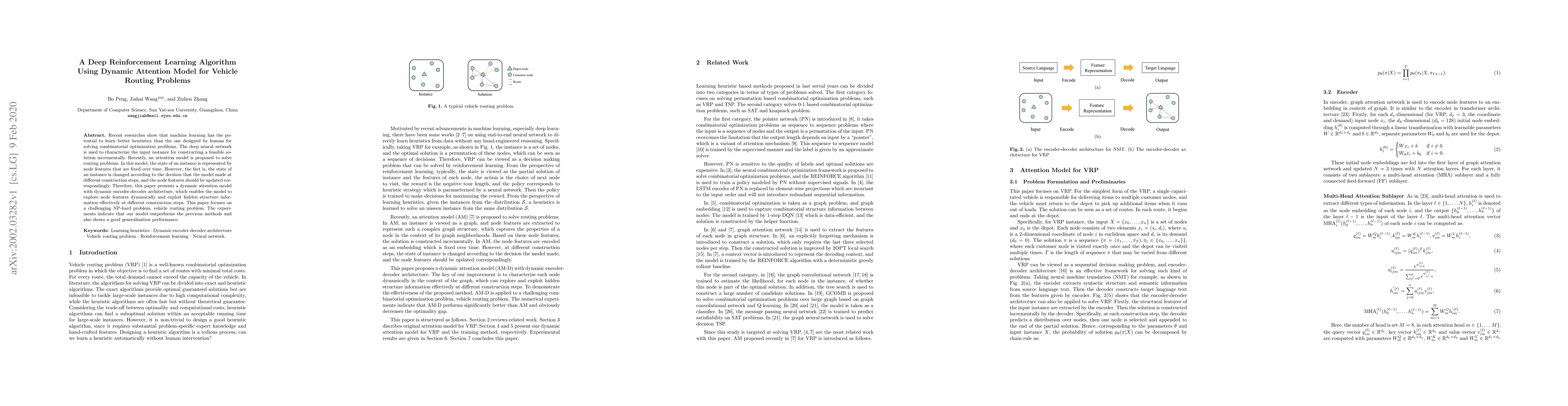 This paper proposes a deep reinforcement learning algorithm using a dynamic attention model for solving vehicle routing problems. The dynamic attention model updates node features dynamically, enabling better exploration of hidden structures and outperforming previous methods.