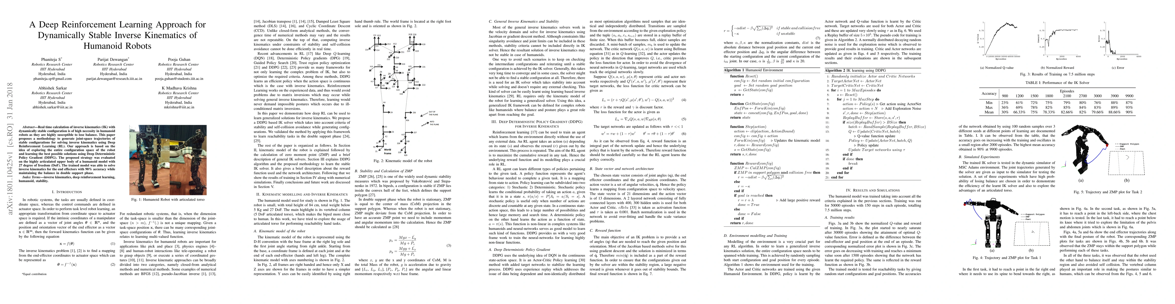 This paper proposes a Deep Reinforcement Learning approach using Deep Deterministic Policy Gradient to dynamically calculate stable inverse kinematics for humanoid robots, achieving 90% accuracy in joint-space trajectory generation while maintaining balance in the double support phase.