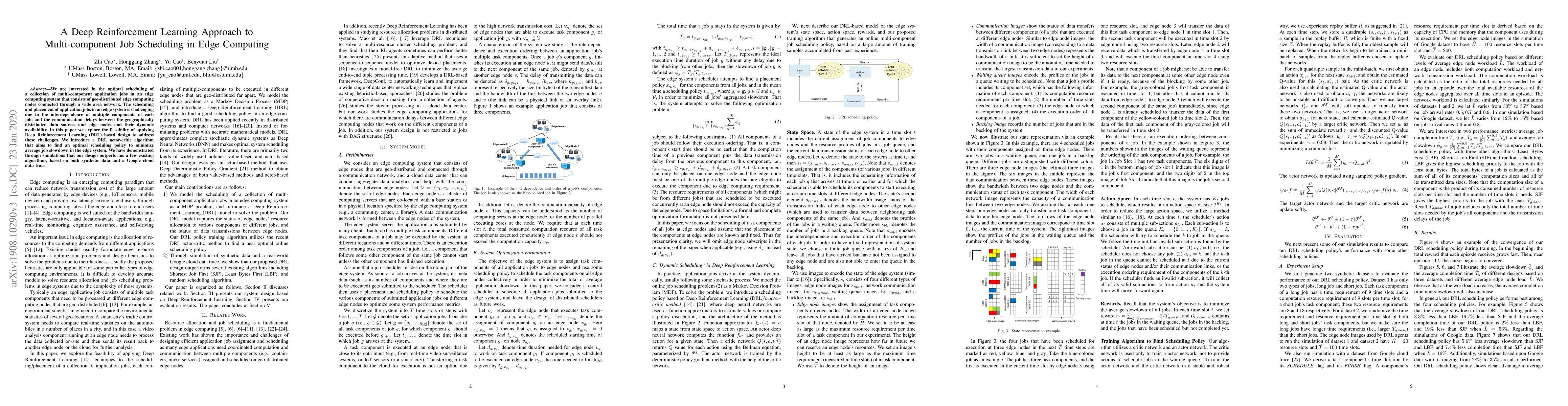 This paper proposes a Deep Reinforcement Learning (DRL) approach to optimize the scheduling of multi-component jobs in geo-distributed edge computing systems. The DRL algorithm aims to minimize average job slowdown, outperforming existing algorithms in simulations based on both synthetic and real-world data.