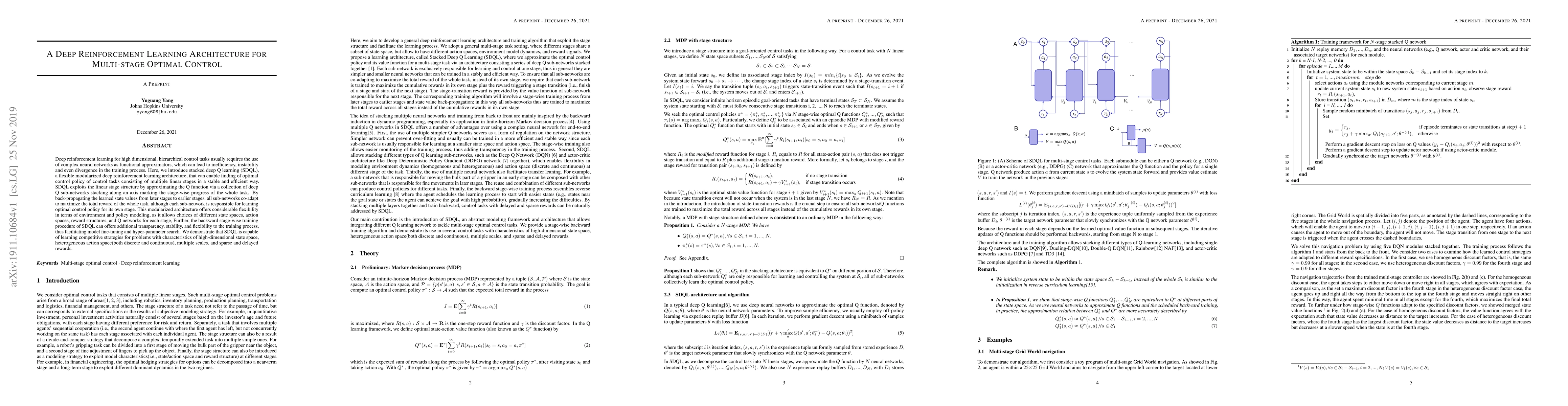 This paper introduces stacked deep Q learning (SDQL), a modularized deep reinforcement learning architecture designed for multi-stage optimal control tasks. SDQL leverages a collection of deep Q sub-networks to efficiently and stably learn optimal control policies by back-propagating learned state values across stages, demonstrating competitive performance in high-dimensional, heterogeneous, and sparse reward environments.