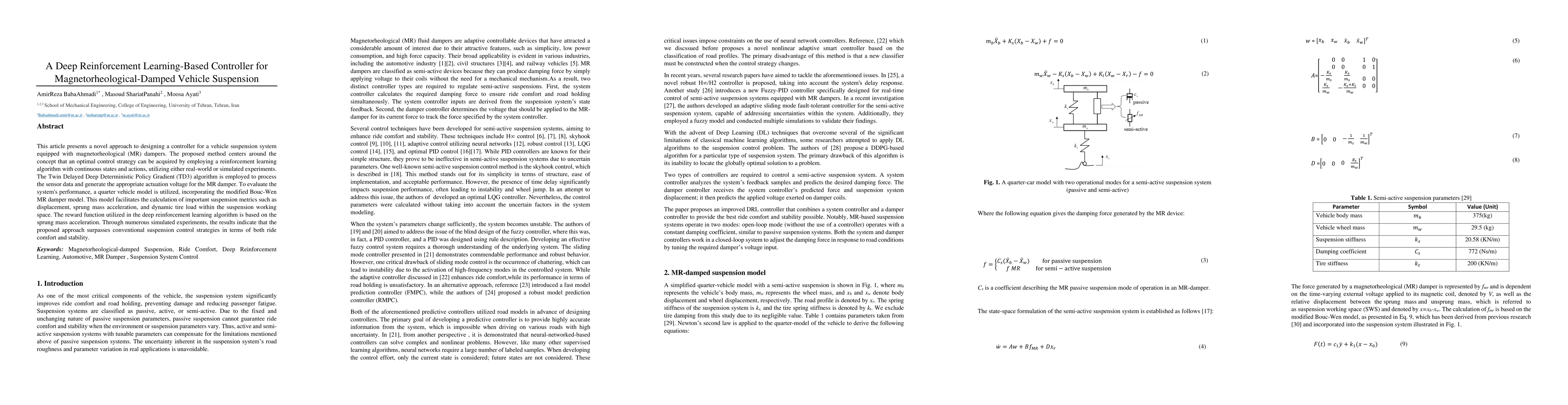 This paper introduces a deep reinforcement learning-based controller for magnetorheological-damped vehicle suspension, utilizing a TD3 algorithm to optimize control strategies through simulated experiments. The approach enhances ride comfort and stability compared to traditional methods, as shown in simulated tests.