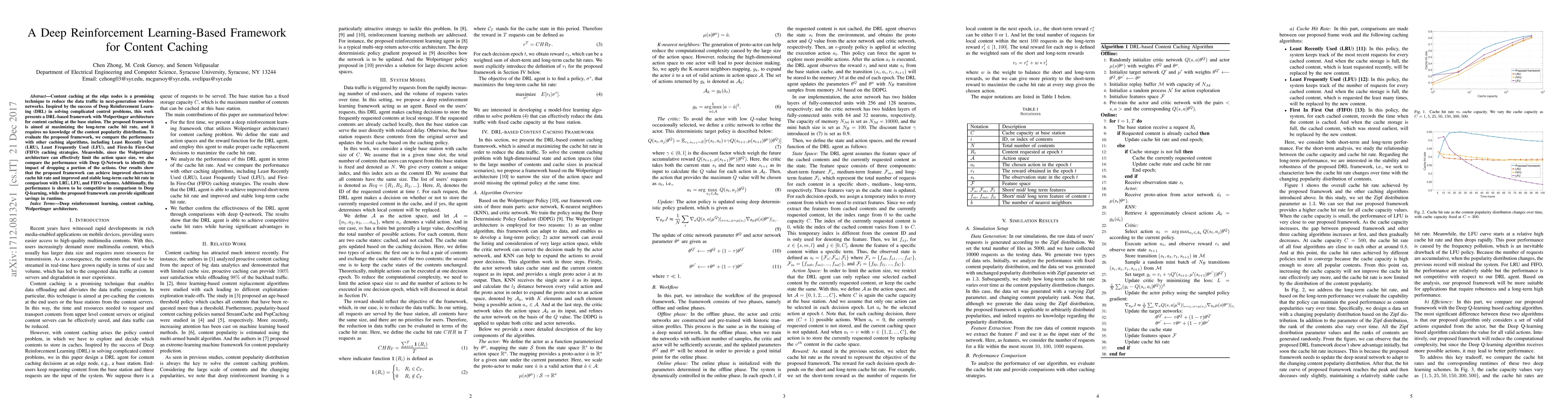 This paper proposes a Deep Reinforcement Learning-based framework using the Wolpertinger architecture for content caching at base stations to maximize cache hit rates without prior knowledge of content popularity. The framework outperforms traditional caching strategies like LRU, LFU, and FIFO, and is competitive with Deep Q-Network, while significantly reducing runtime.