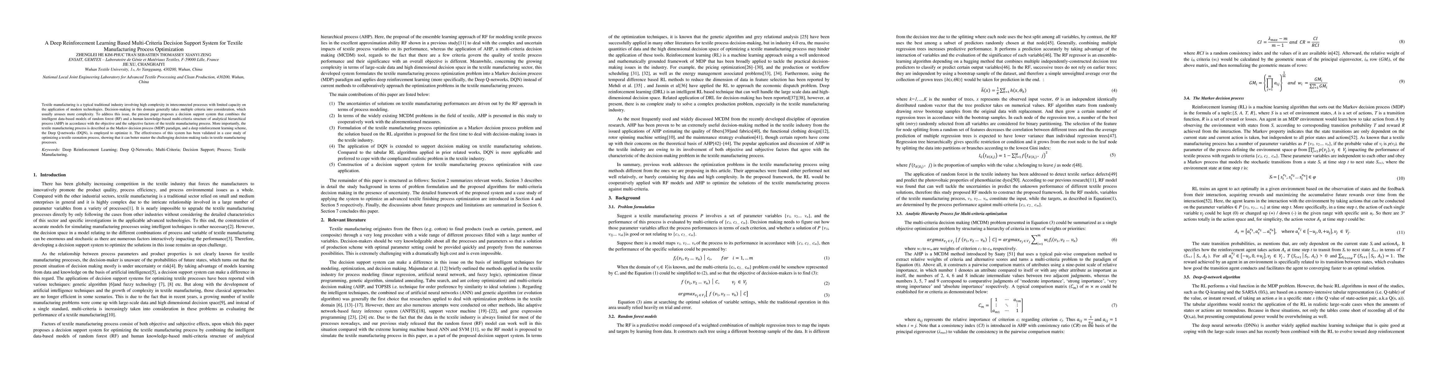 This paper proposes a multi-criteria decision support system for optimizing textile manufacturing processes using deep reinforcement learning and combining random forest models with analytical hierarchical process. The system effectively optimizes the ozonation process, demonstrating improved decision-making capabilities.
