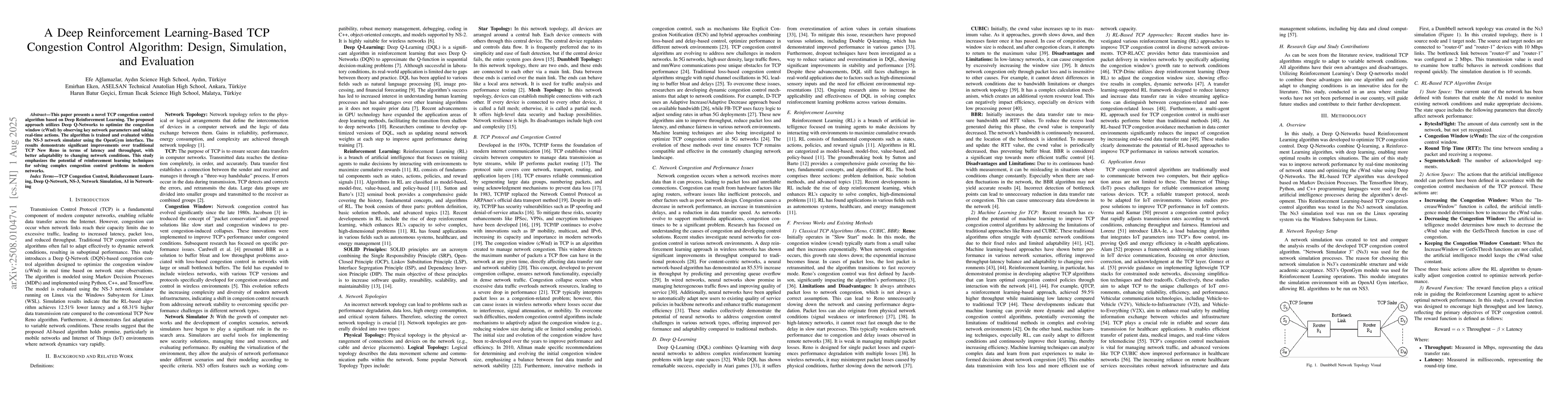 This paper presents a novel TCP congestion control algorithm based on Deep Reinforcement Learning. The proposed approach utilizes Deep Q-Networks to optimize the congestion window (cWnd) by observing key network parameters and taking real-time actions. The algorithm is trained and evaluated within the NS-3 network simulator using the OpenGym interface. The results demonstrate significant improvements over traditional TCP New Reno in terms of latency and throughput, with better adaptability to changing network conditions. This study emphasizes the potential of reinforcement learning techniques for solving complex congestion control problems in modern networks.