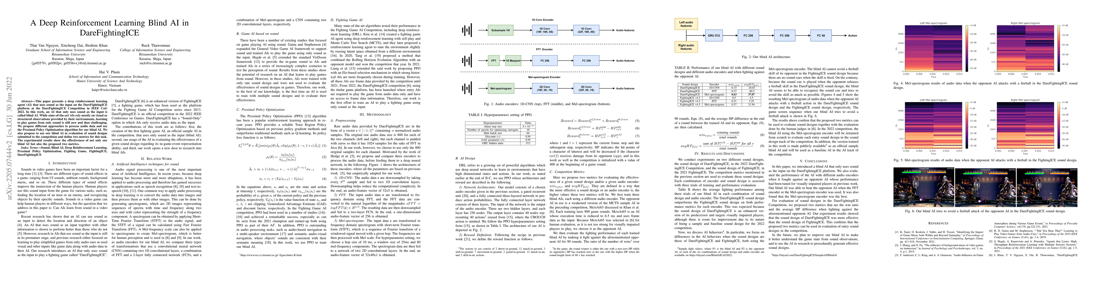 This paper introduces a deep reinforcement learning agent that plays games on the DareFightingICE platform using only sound as input, termed a blind AI. The study proposes various audio processing methods and employs Proximal Policy Optimization, demonstrating the agent's effectiveness and introducing new metrics for evaluating sound designs in the competition.