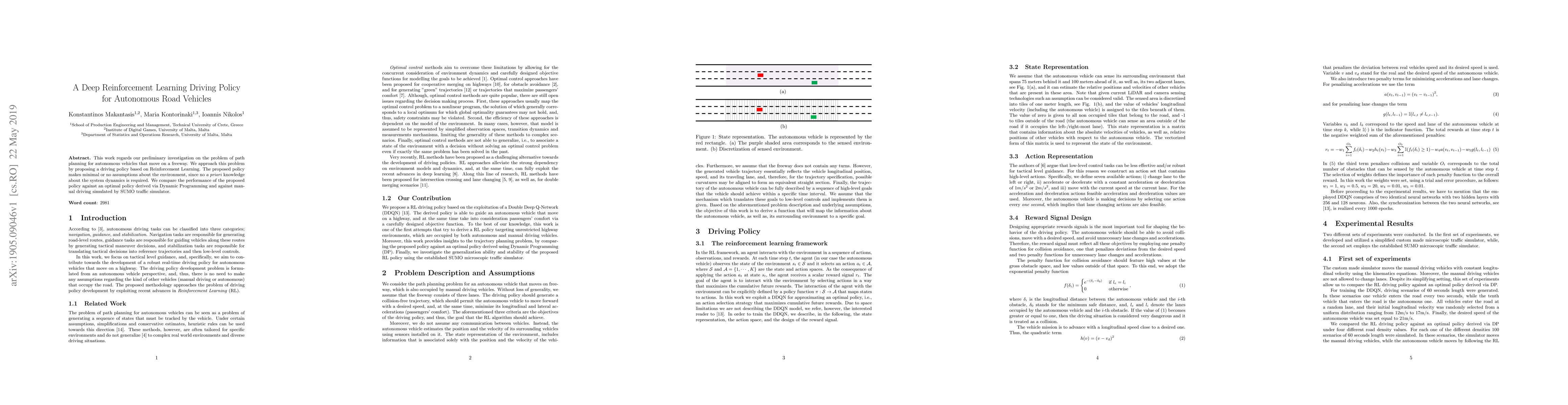 This work regards our preliminary investigation on the problem of path planning for autonomous vehicles that move on a freeway. We approach this problem by proposing a driving policy based on Reinforcement Learning. The proposed policy makes minimal or no assumptions about the environment, since no a priori knowledge about the system dynamics is required. We compare the performance of the proposed policy against an optimal policy derived via Dynamic Programming and against manual driving simulated by SUMO traffic simulator.