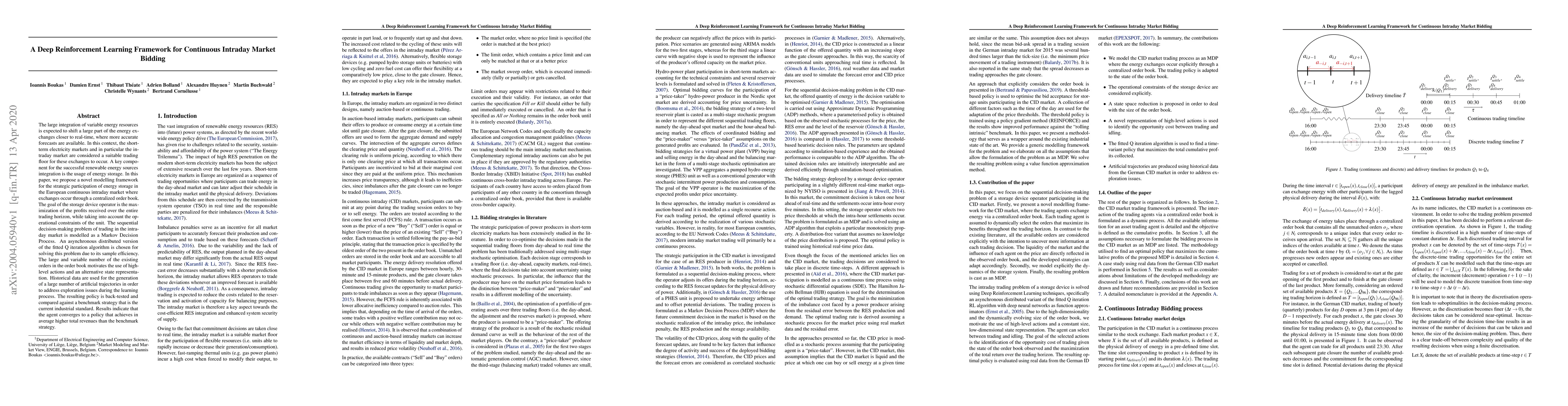 This paper proposes a deep reinforcement learning framework to optimize energy storage bidding in the European intraday market, using a Markov Decision Process and fitted Q iteration. The model achieves higher average revenues compared to the current industrial standard, demonstrating improved strategic participation in real-time energy trading.