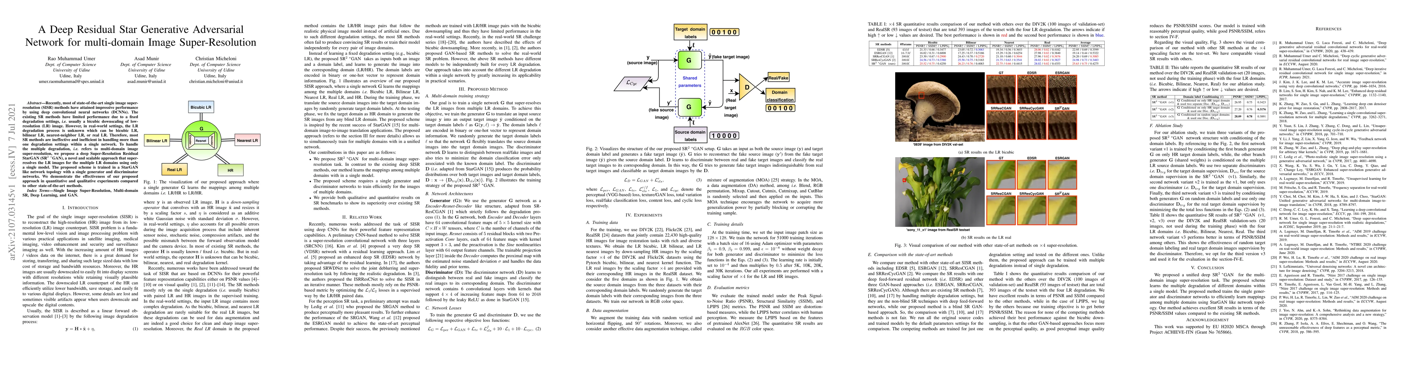 The paper proposes a Deep Residual Star Generative Adversarial Network (SR2*GAN) for multi-domain image super-resolution, addressing the limitation of existing methods that handle only fixed degradation settings. The proposed approach effectively super-resolves low-resolution images across multiple degradation types using a single scalable model.