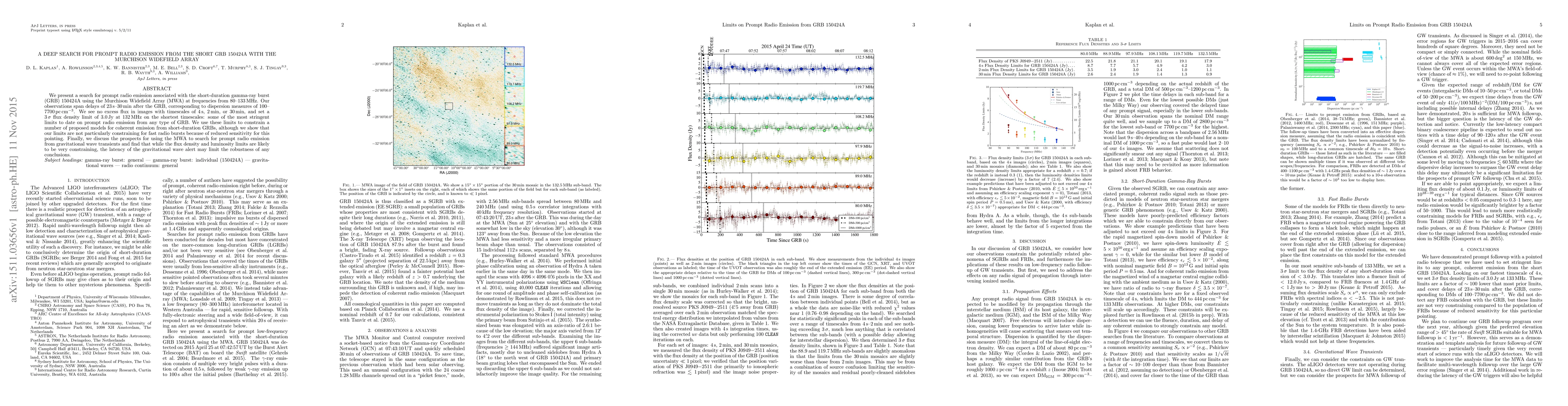 This study finds no evidence of prompt radio emission from the short-duration gamma-ray burst GRB 150424A using the Murchison Widefield Array, setting some of the most stringent limits on such emissions to date.