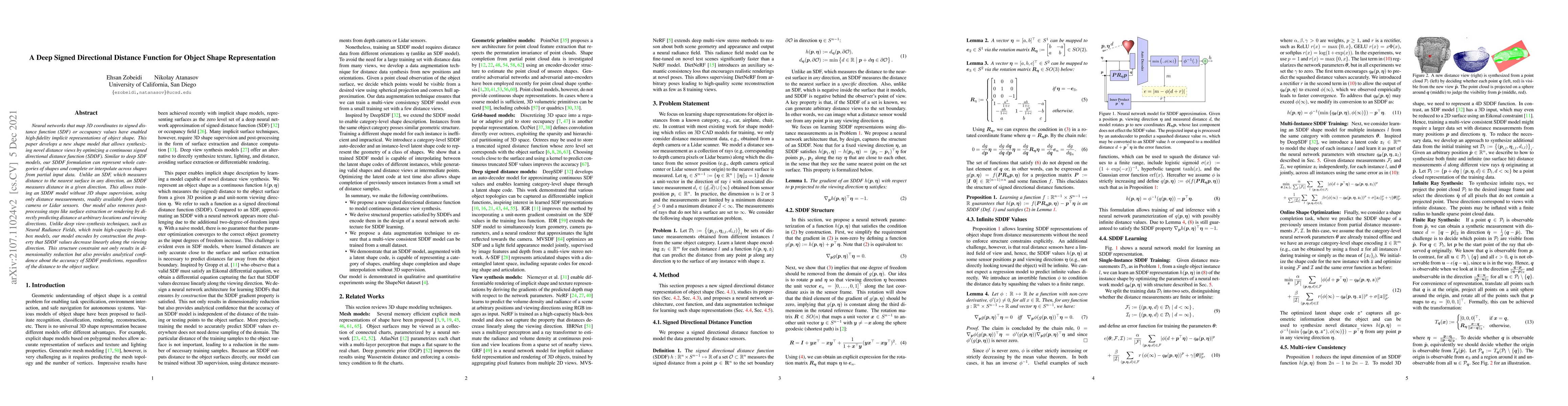 This paper introduces a deep signed directional distance function (SDDF) for object shape representation, enabling novel distance views through continuous optimization. Unlike traditional signed distance functions, SDDF measures distance in a specific direction, allowing training without 3D shape supervision, and directly predicting distances at arbitrary locations and viewing directions.