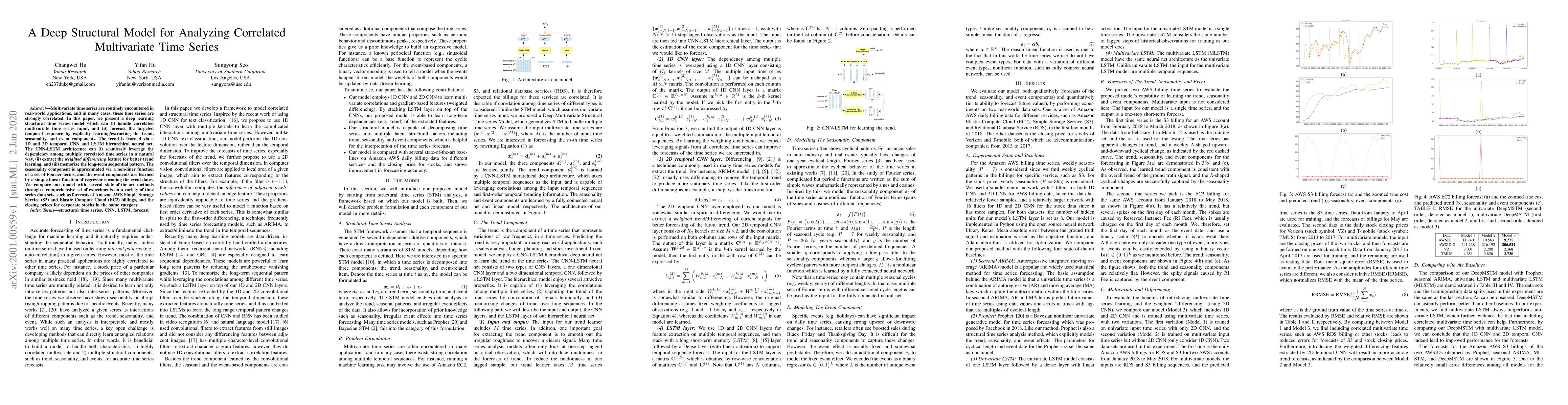 Multivariate time series are routinely encountered in real-world applications, and in many cases, these time series are strongly correlated. In this paper, we present a deep learning structural time series model which can (i) handle correlated multivariate time series input, and (ii) forecast the targeted temporal sequence by explicitly learning/extracting the trend, seasonality, and event components. The trend is learned via a 1D and 2D temporal CNN and LSTM hierarchical neural net. The CNN-LSTM architecture can (i) seamlessly leverage the dependency among multiple correlated time series in a natural way, (ii) extract the weighted differencing feature for better trend learning, and (iii) memorize the long-term sequential pattern. The seasonality component is approximated via a non-liner function of a set of Fourier terms, and the event components are learned by a simple linear function of regressor encoding the event dates. We compare our model with several state-of-the-art methods through a comprehensive set of experiments on a variety of time series data sets, such as forecasts of Amazon AWS Simple Storage Service (S3) and Elastic Compute Cloud (EC2) billings, and the closing prices for corporate stocks in the same category.