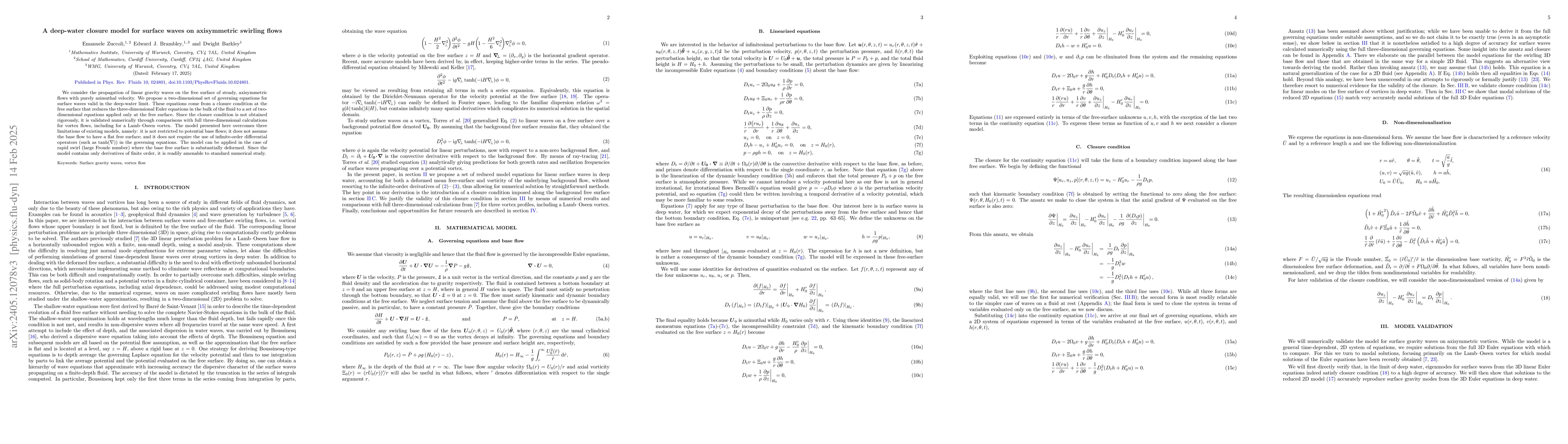 We consider the propagation of linear gravity waves on the free surface of steady, axisymmetric flows with purely azimuthal velocity. We propose a two-dimensional set of governing equations for surface waves valid in the deep-water limit. These equations come from a closure condition at the free surface that reduces the three-dimensional Euler equations in the bulk of the fluid to a set of two-dimensional equations applied only at the free surface. Since the closure condition is not obtained rigorously, it is validated numerically through comparisons with full three-dimensional calculations for vortex flows, including for a Lamb--Oseen vortex. The model presented here overcomes three limitations of existing models, namely: it is not restricted to potential base flows; it does not assume the base flow to have a flat free surface; and it does not require the use of infinite-order differential operators (such as $\tanh(\nabla)$) in the governing equations. The model can be applied in the case of rapid swirl (large Froude number) where the base free surface is substantially deformed. Since the model contains only derivatives of finite order, it is readily amenable to standard numerical study.
