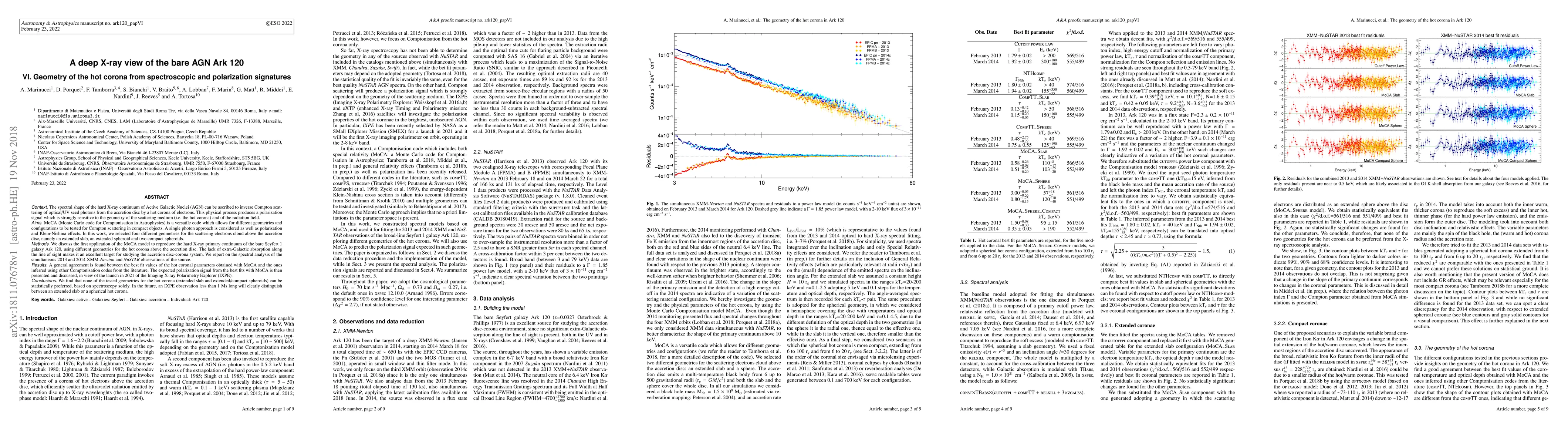 This paper investigates the geometry of the hot corona in the AGN Ark 120 using the MoCA model, comparing four different geometries: extended slab, extended spheroid, and two compact spheroids. The study finds no statistically preferred geometry based on spectroscopy alone, but suggests that future IXPE observations may distinguish between these models.