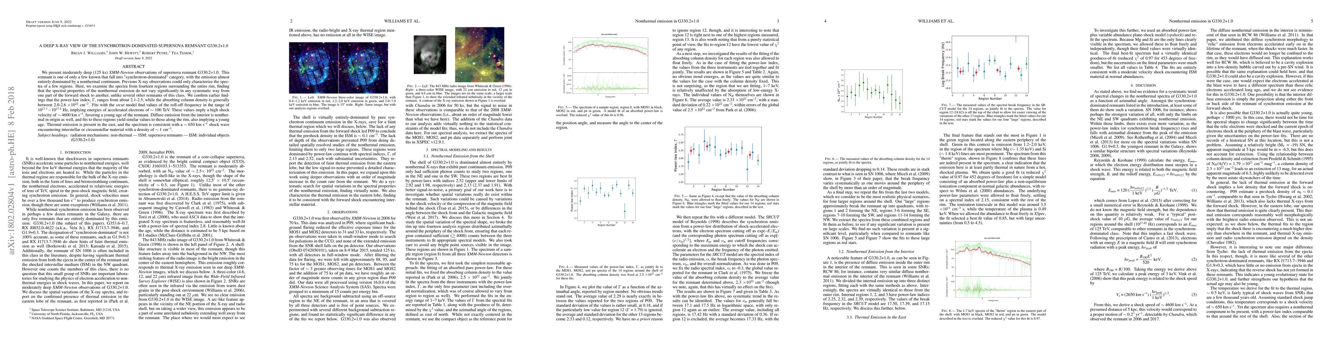 We present moderately deep (125 ks) {\it XMM-Newton} observations of supernova remnant G330.2$+$1.0. This remnant is one of only a few known that fall into "synchrotron-dominated" category, with the emission almost entirely dominated by a nonthermal continuum. Previous X-ray observations could only characterize the spectra of a few regions. Here, we examine the spectra from fourteen regions surrounding the entire rim, finding that the spectral properties of the nonthermal emission do not vary significantly in any systematic way from one part of the forward shock to another, unlike several other remnants of this class. We confirm earlier findings that the power-law index, $\Gamma$, ranges from about 2.1-2.5, while the absorbing column density is generally between 2.0-2.6 $\times 10^{22}$ cm$^{-2}$. Fits with the {\it srcut} model find values of the roll-off frequency in the range of 10$^{17.1} - 10^{17.5}$ Hz, implying energies of accelerated electrons of $\sim 100$ TeV. These values imply a high shock velocity of $\sim 4600$ km s$^{-1}$, favoring a young age of the remnant. Diffuse emission from the interior is nonthermal in origin as well, and fits to these regions yield similar values to those along the rim, also implying a young age. Thermal emission is present in the east, and the spectrum is consistent with a $\sim 650$ km s$^{-1}$ shock wave encountering interstellar or circumstellar material with a density of $\sim 1$ cm$^{-3}$.