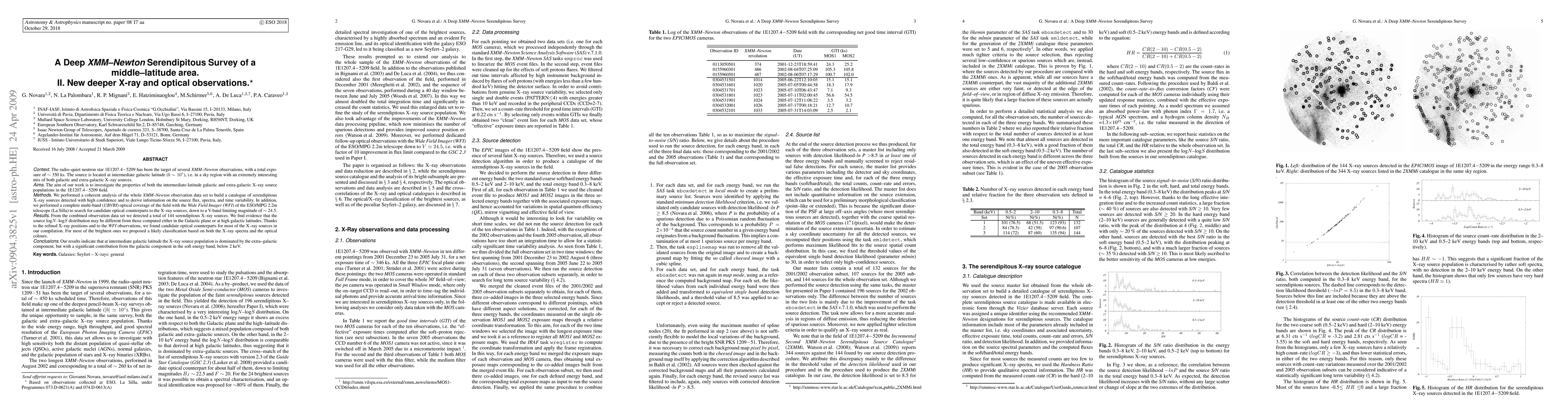 The radio-quiet neutron star 1E1207.4-5209 has been the target of several XMM-Newton observations, with a total exposure of ~350 ks. The source is located at intermediate galactic latitude (b~10 degrees), i.e. in a sky region with an extremely interesting mix of both galactic and extra-galactic X-ray sources. The aim of our work is to investigate the properties of both the intermediate-latitude galactic and extra-galactic X-ray source populations in the 1E1207.4-5209 field. We performed a coherent analysis of the whole XMM-Newton observation data set to build a catalogue of serendipitous X-ray sources detected with high confidence and to derive information on the source flux, spectra, and time variability. In addition, we performed a complete multi-band (UBVRI) optical coverage of the field with the Wide Field Imager (WFI) of the ESO/MPG 2.2m telescope (La Silla) to search for candidate optical counterparts to the X-ray sources, down to a V-band limiting magnitude of ~24.5. We detected a total of 144 serendipitous X-ray sources. Thanks to the refined X-ray positions and to the WFI observations, we found candidate optical counterparts for most of the X-ray sources in our compilation. For most of the brightest ones we proposed a likely classification based on both the X-ray spectra and the optical colours. Our results indicate that at intermediate galactic latitude the X-ray source population is dominated by the extra-galactic component, but with a significant contribution from the galactic component in the soft energy band, below 2 keV.