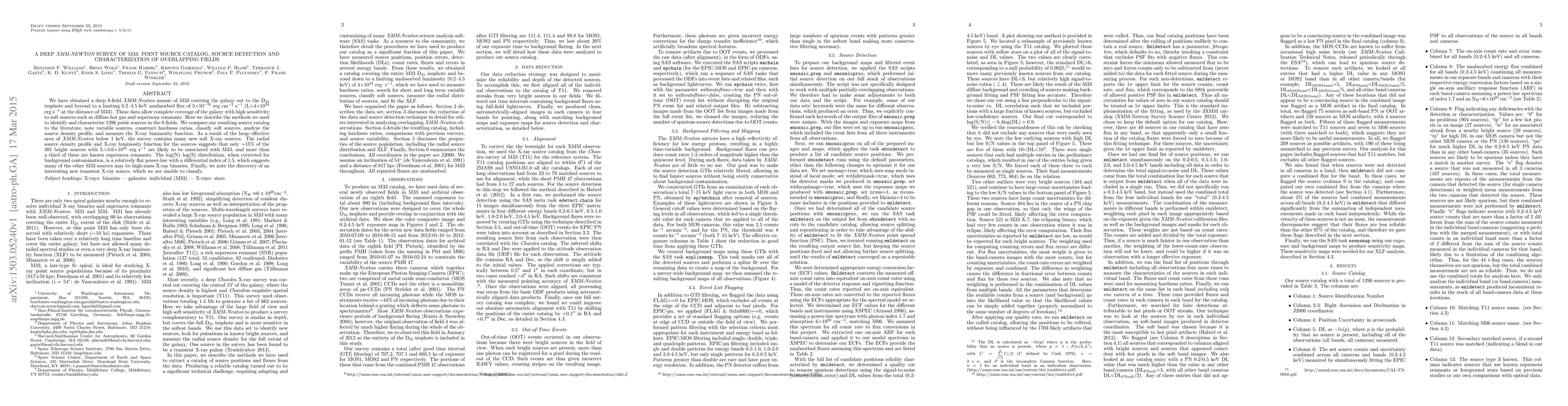 We have obtained a deep 8-field XMM-Newton mosaic of M33 covering the galaxy out to the D$_{25}$ isophote and beyond to a limiting 0.2--4.5 keV unabsorbed flux of 5$\times$10$^{-16}$ erg cm$^{-2}$ s$^{-1}$ (L${>}$4$\times$10$^{34}$ erg s$^{-1}$ at the distance of M33). These data allow complete coverage of the galaxy with high sensitivity to soft sources such as diffuse hot gas and supernova remnants. Here we describe the methods we used to identify and characterize 1296 point sources in the 8 fields. We compare our resulting source catalog to the literature, note variable sources, construct hardness ratios, classify soft sources, analyze the source density profile, and measure the X-ray luminosity function. As a result of the large effective area of XMM-Newton below 1 keV, the survey contains many new soft X-ray sources. The radial source density profile and X-ray luminosity function for the sources suggests that only $\sim$15% of the 391 bright sources with L${>}$3.6$\times$10$^{35}$ erg s$^{-1}$ are likely to be associated with M33, and more than a third of these are known supernova remnants. The log(N)--log(S) distribution, when corrected for background contamination, is a relatively flat power-law with a differential index of 1.5, which suggests many of the other M33 sources may be high-mass X-ray binaries. Finally, we note the discovery of an interesting new transient X-ray source, which we are unable to classify.