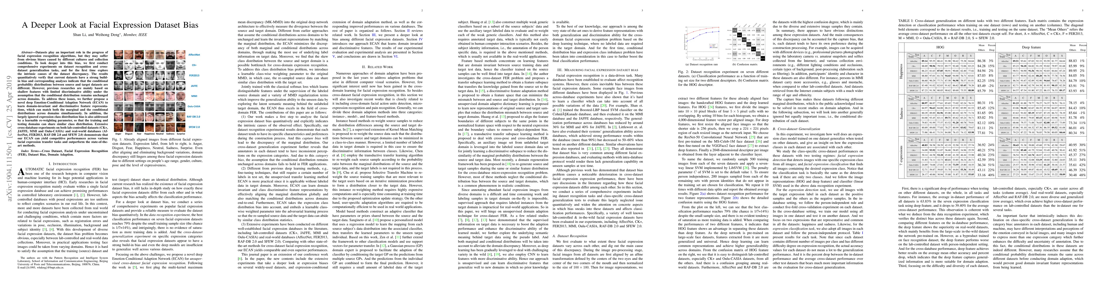 Datasets play an important role in the progress of facial expression recognition algorithms, but they may suffer from obvious biases caused by different cultures and collection conditions. To look deeper into this bias, we first conduct comprehensive experiments on dataset recognition and crossdataset generalization tasks, and for the first time explore the intrinsic causes of the dataset discrepancy. The results quantitatively verify that current datasets have a strong buildin bias and corresponding analyses indicate that the conditional probability distributions between source and target datasets are different. However, previous researches are mainly based on shallow features with limited discriminative ability under the assumption that the conditional distribution remains unchanged across domains. To address these issues, we further propose a novel deep Emotion-Conditional Adaption Network (ECAN) to learn domain-invariant and discriminative feature representations, which can match both the marginal and the conditional distributions across domains simultaneously. In addition, the largely ignored expression class distribution bias is also addressed by a learnable re-weighting parameter, so that the training and testing domains can share similar class distribution. Extensive cross-database experiments on both lab-controlled datasets (CK+, JAFFE, MMI and Oulu-CASIA) and real-world databases (AffectNet, FER2013, RAF-DB 2.0 and SFEW 2.0) demonstrate that our ECAN can yield competitive performances across various facial expression transfer tasks and outperform the state-of-theart methods.