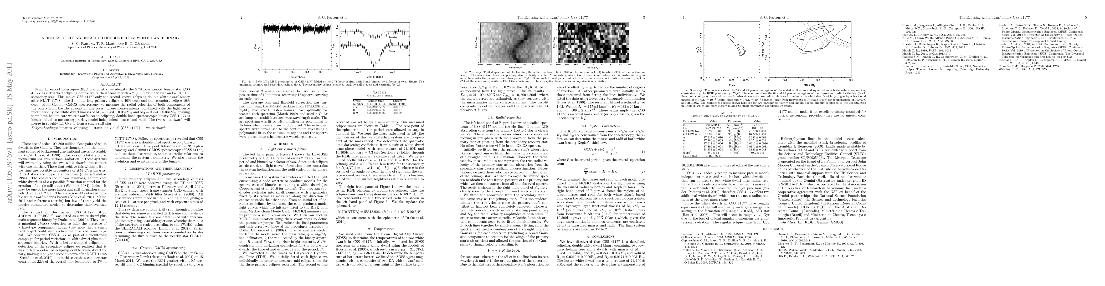 CSS 41177 is identified as a 2.78-hour period detached eclipsing double helium white dwarf binary with masses of 0.283±0.064Msun and 0.274±0.034Msun, set to merge in about 1.1 Gyr to form a single sdB star. It is the second known eclipsing double white dwarf binary.