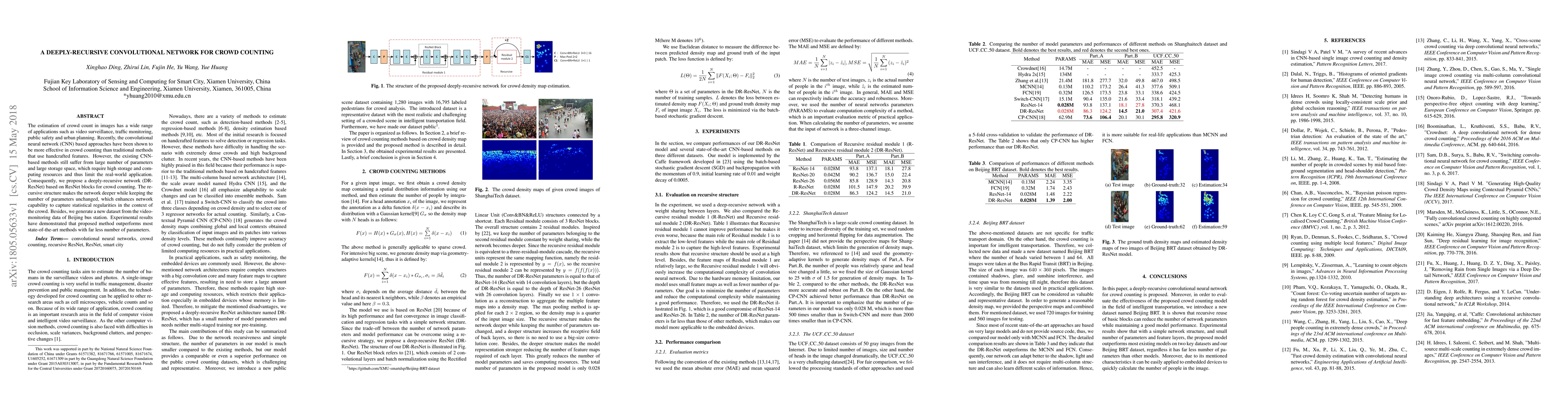 This paper proposes a deeply-recursive convolutional network (DR-ResNet) based on ResNet blocks to enhance crowd counting accuracy while minimizing parameters. The recursive structure maintains parameter efficiency, leading to better performance compared to state-of-the-art methods, as demonstrated on a new dataset from Beijing bus station.