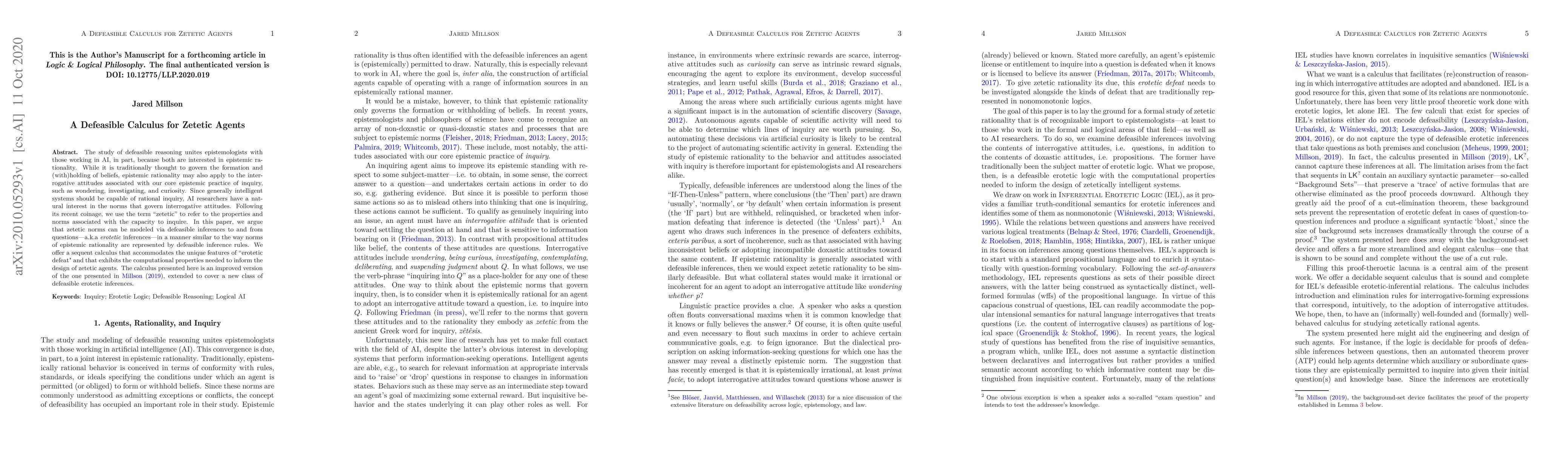 The study of defeasible reasoning unites epistemologists with those working in AI, in part, because both are interested in epistemic rationality. While it is traditionally thought to govern the formation and (with)holding of beliefs, epistemic rationality may also apply to the interrogative attitudes associated with our core epistemic practice of inquiry, such as wondering, investigating, and curiosity. Since generally intelligent systems should be capable of rational inquiry, AI researchers have a natural interest in the norms that govern interrogative attitudes. Following its recent coinage, we use the term "zetetic" to refer to the properties and norms associated with the capacity to inquire. In this paper, we argue that zetetic norms can be modeled via defeasible inferences to and from questions---a.k.a erotetic inferences---in a manner similar to the way norms of epistemic rationality are represented by defeasible inference rules. We offer a sequent calculus that accommodates the unique features of "erotetic defeat" and that exhibits the computational properties needed to inform the design of zetetic agents. The calculus presented here is an improved version of the one presented in Millson (2019), extended to cover a new class of defeasible erotetic inferences.