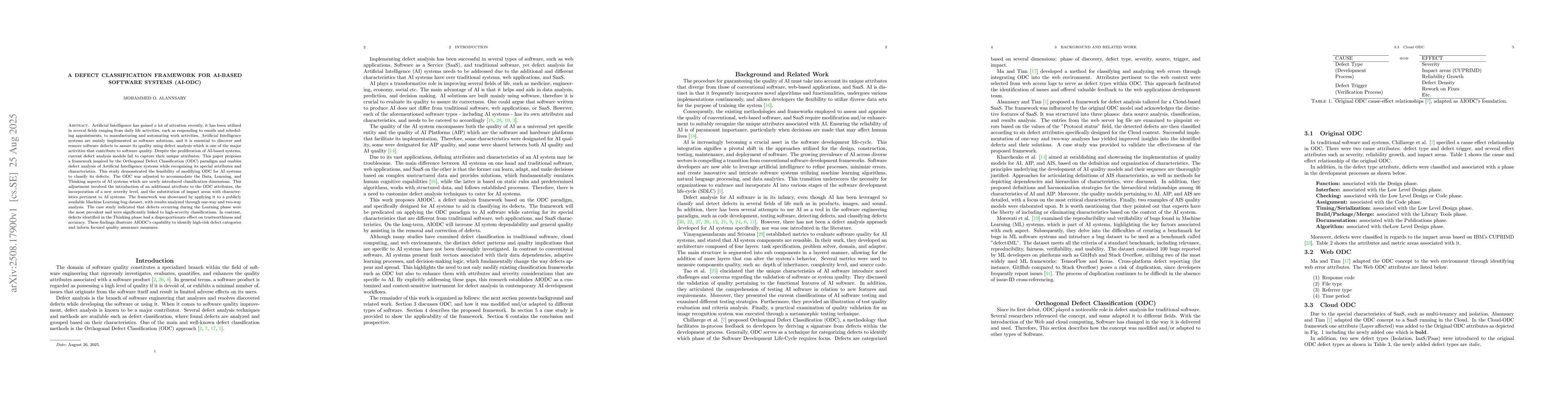 Artificial Intelligence has gained a lot of attention recently, it has been utilized in several fields ranging from daily life activities, such as responding to emails and scheduling appointments, to manufacturing and automating work activities. Artificial Intelligence systems are mainly implemented as software solutions, and it is essential to discover and remove software defects to assure its quality using defect analysis which is one of the major activities that contribute to software quality. Despite the proliferation of AI-based systems, current defect analysis models fail to capture their unique attributes. This paper proposes a framework inspired by the Orthogonal Defect Classification (ODC) paradigm and enables defect analysis of Artificial Intelligence systems while recognizing its special attributes and characteristics. This study demonstrated the feasibility of modifying ODC for AI systems to classify its defects. The ODC was adjusted to accommodate the Data, Learning, and Thinking aspects of AI systems which are newly introduced classification dimensions. This adjustment involved the introduction of an additional attribute to the ODC attributes, the incorporation of a new severity level, and the substitution of impact areas with characteristics pertinent to AI systems. The framework was showcased by applying it to a publicly available Machine Learning bug dataset, with results analyzed through one-way and two-way analysis. The case study indicated that defects occurring during the Learning phase were the most prevalent and were significantly linked to high-severity classifications. In contrast, defects identified in the Thinking phase had a disproportionate effect on trustworthiness and accuracy. These findings illustrate AIODC's capability to identify high-risk defect categories and inform focused quality assurance measures.