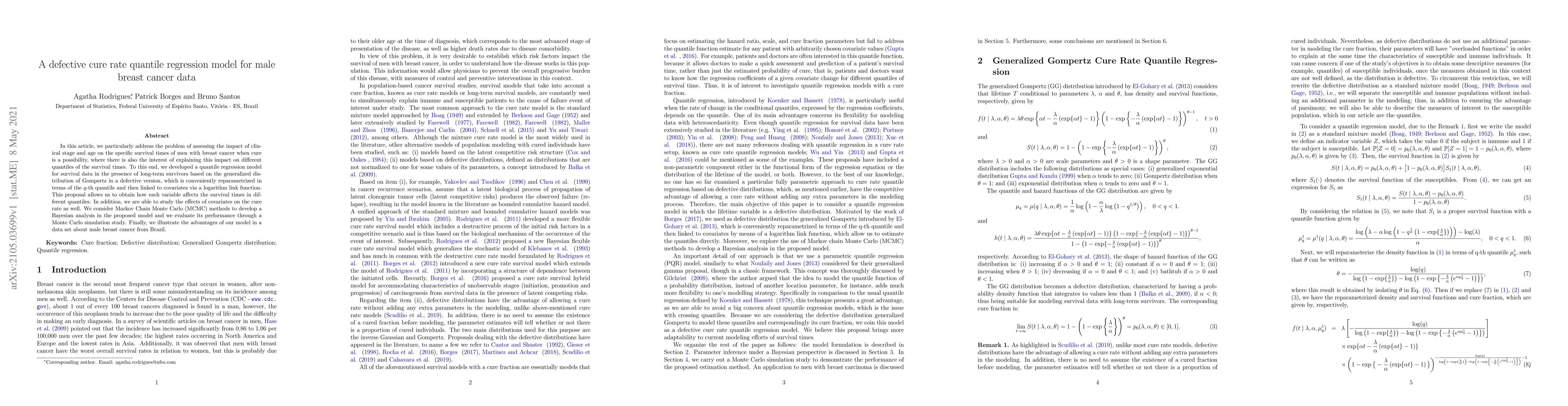 This paper proposes a defective cure rate quantile regression model based on the generalized Gompertz distribution to assess the impact of clinical stage and age on male breast cancer survival times, considering different survival quantiles and the cure rate. The model employs Bayesian analysis via MCMC and is demonstrated on a Brazilian male breast cancer dataset.