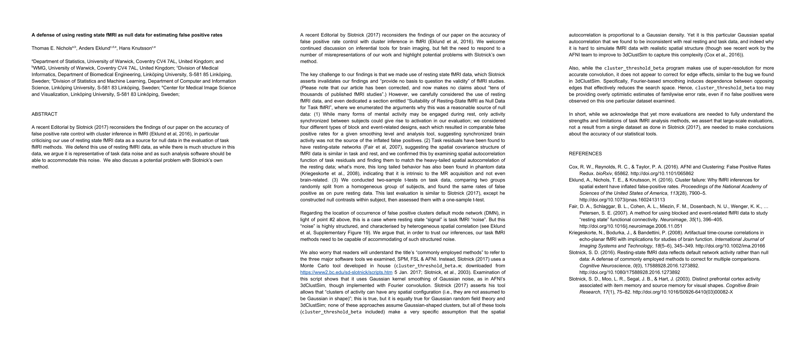 A recent Editorial by Slotnick (2017) reconsiders the findings of our paper on the accuracy of false positive rate control with cluster inference in fMRI (Eklund et al, 2016), in particular criticising our use of resting state fMRI data as a source for null data in the evaluation of task fMRI methods. We defend this use of resting fMRI data, as while there is much structure in this data, we argue it is representative of task data noise and as such analysis software should be able to accommodate this noise. We also discuss a potential problem with Slotnick's own method.