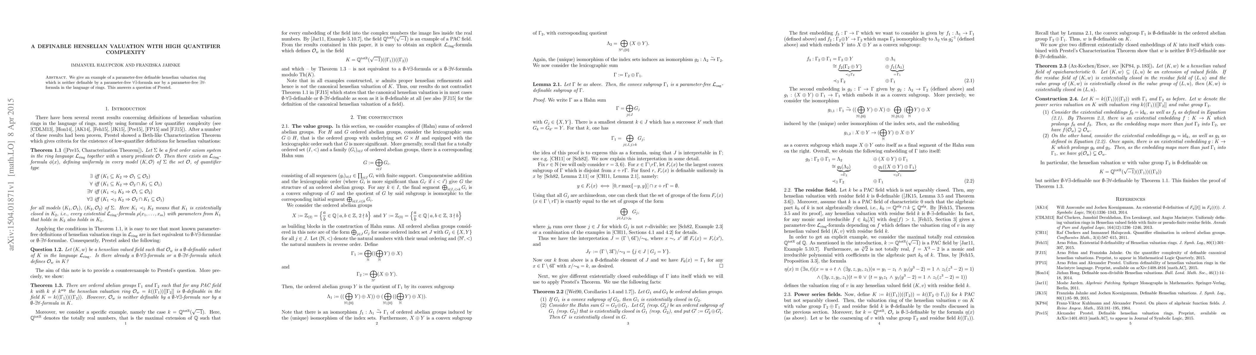 The paper presents a parameter-free definable henselian valuation ring that cannot be defined by parameter-free $\forall\exists$ or $\exists\forall$ formulas in the language of rings, addressing a question posed by Prestel.