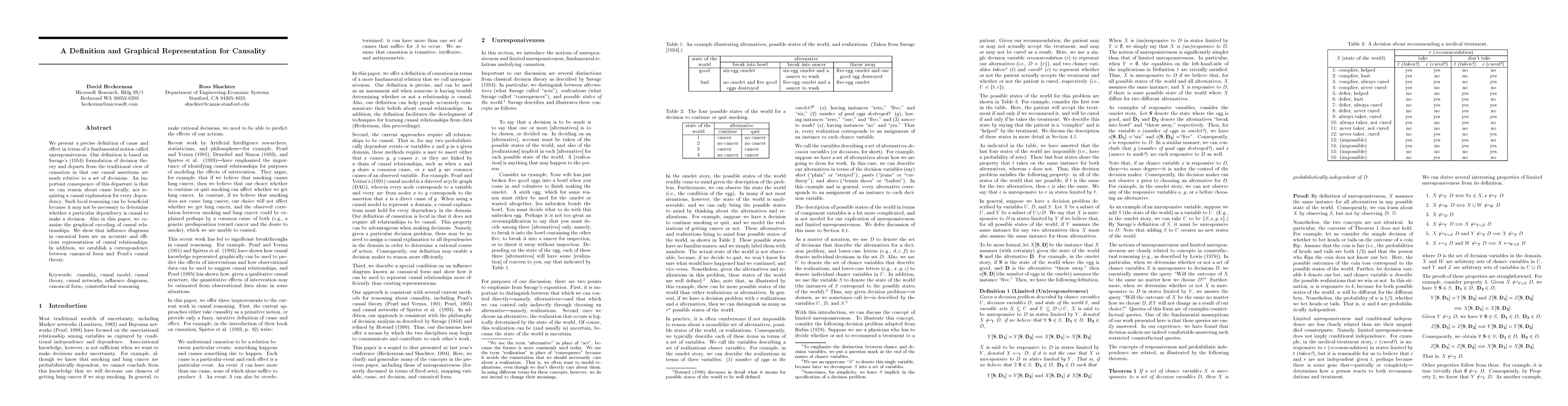 We present a precise definition of cause and effect in terms of a fundamental notion called unresponsiveness. Our definition is based on Savage's (1954) formulation of decision theory and departs from the traditional view of causation in that our causal assertions are made relative to a set of decisions. An important consequence of this departure is that we can reason about cause locally, not requiring a causal explanation for every dependency. Such local reasoning can be beneficial because it may not be necessary to determine whether a particular dependency is causal to make a decision. Also in this paper, we examine the graphical encoding of causal relationships. We show that influence diagrams in canonical form are an accurate and efficient representation of causal relationships. In addition, we establish a correspondence between canonical form and Pearl's causal theory.