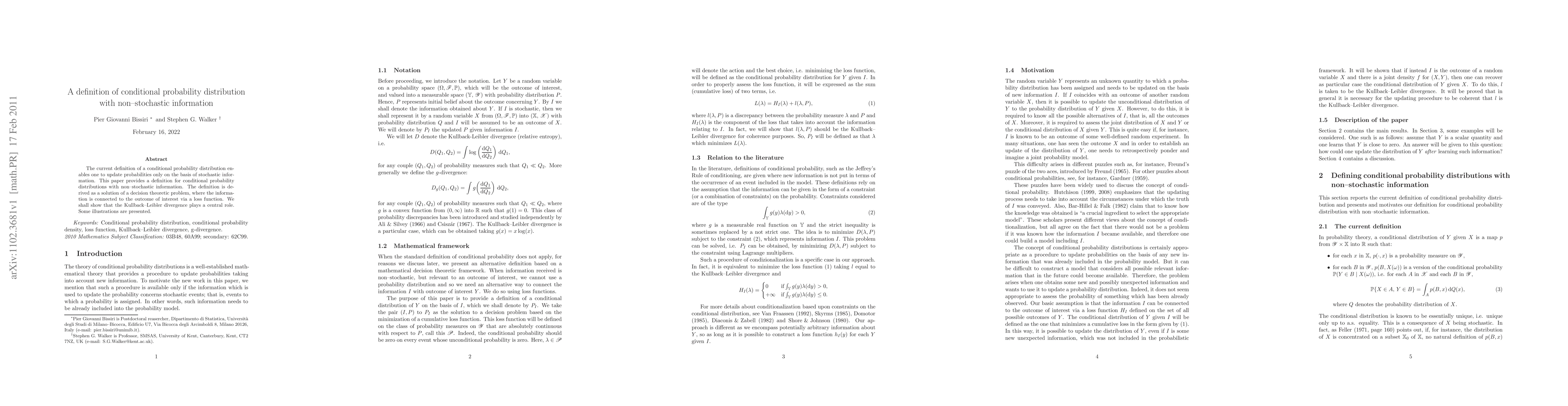This paper defines a new type of conditional probability distribution that can update probabilities based on non-stochastic information, using the Kullback-Leibler divergence as a key concept. The definition is derived from a decision-theoretic problem and has implications for updating probabilities in uncertain situations.