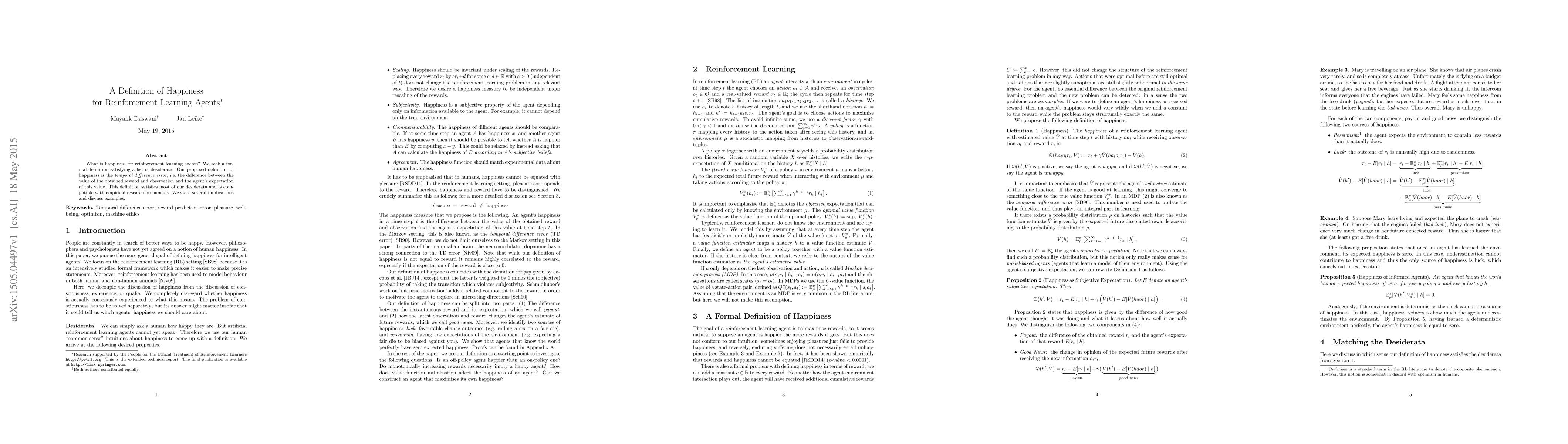 The paper proposes a formal definition of happiness for reinforcement learning agents as the temporal difference error, aligning with empirical human research and satisfying several key criteria. This definition has implications for understanding agent behavior and decision-making processes.