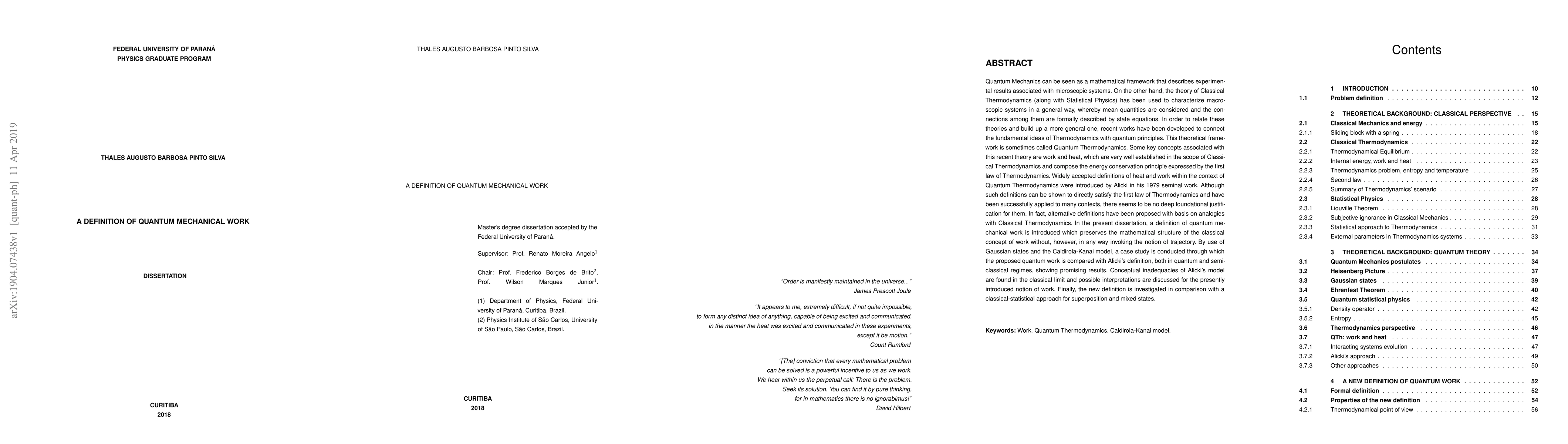 A definition of quantum mechanical work is introduced in this dissertation, preserving the mathematical structure of the Classical Mechanics concept of work without, however, in any way invoking the notion of trajectory. By use of Gaussian states and the Caldirola-Kanai model, a case study is conducted through which the proposed quantum work is compared with another Quantum Thermodynamics well-known definition, both in quantum and semiclassical regimes, showing promising results. Finally the new definition is investigated in comparison with a classical-statistical approach for superposition and mixed states.