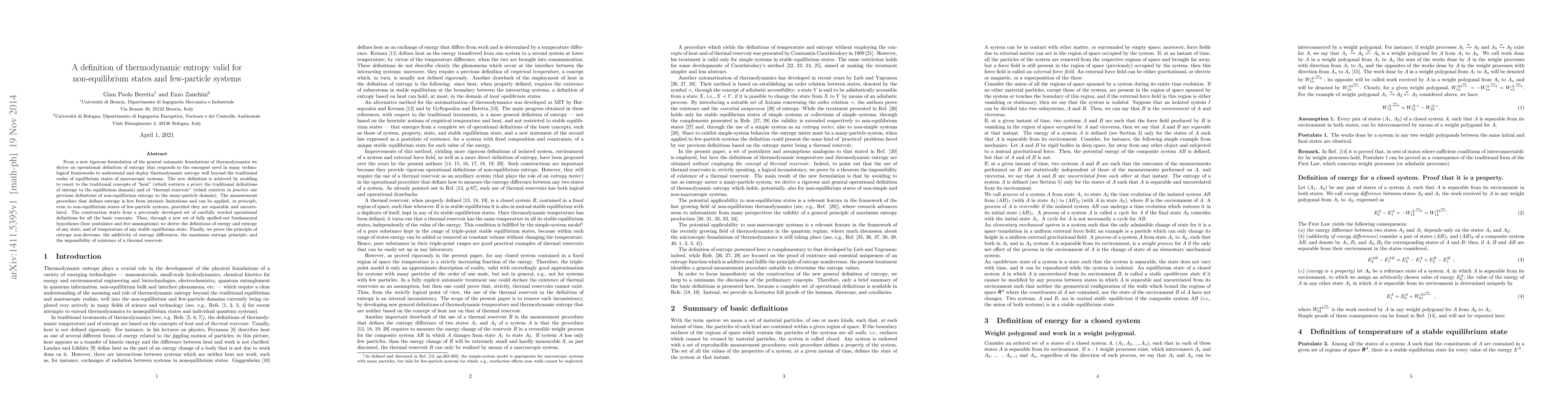 From a new rigorous formulation of the general axiomatic foundations of thermodynamics we derive an operational definition of entropy that responds to the emergent need in many technological frameworks to understand and deploy thermodynamic entropy well beyond the traditional realm of equilibrium states of macroscopic systems. The new definition is achieved by avoiding to resort to the traditional concepts of "heat" (which restricts $a$ $priori$ the traditional definitions of entropy to the equilibrium domain) and of "thermal reservoir" (which restricts $in$ $practice$ our previous definitions of non-equilibrium entropy to the many-particle domain). The measurement procedure that defines entropy is free from intrinsic limitations and can be applied, $in$ $principle$, even to non-equilibrium states of few-particle systems, provided they are separable and uncorrelated. The construction starts from a previously developed set of carefully worded operational definitions for all the basic concepts. Then, through a new set of fully spelled-out fundamental hypotheses (four postulates and five assumptions) we derive the definitions of energy and entropy of any state, and of temperature of any stable equilibrium state. Finally, we prove the principle of entropy non-decrease, the additivity of entropy differences, the maximum entropy principle, and the impossibility of existence of a thermal reservoir.