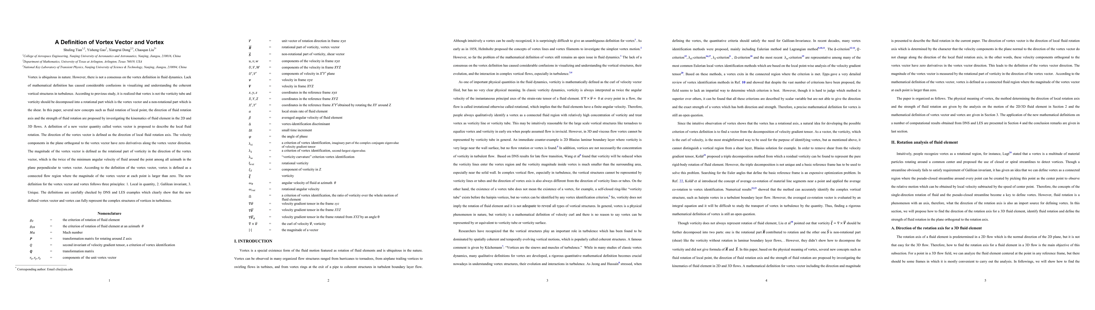 Vortex is ubiquitous in nature. However, there is not a consensus on the vortex definition in fluid dynamics. Lack of mathematical definition has caused considerable confusions in visualizing and understanding the coherent vortical structures in turbulence. According to previous study, it is realized that vortex is not the vorticity tube and vorticity should be decomposed into a rotational part which is the vortex vector and a non-rotational part which is the shear. In this paper, several new concepts such as fluid rotation of local point, the direction of fluid rotation axis and the strength of fluid rotation are proposed by investigating the kinematics of fluid element in the 2D and 3D flows. A definition of a new vector quantity called vortex vector is proposed to describe the local fluid rotation. The direction of the vortex vector is defined as the direction of local fluid rotation axis. The velocity components in the plane orthogonal to the vortex vector have zero derivatives along the vortex vector direction. The magnitude of the vortex vector is defined as the rotational part of vorticity in the direction of the vortex vector, which is the twice of the minimum angular velocity of fluid around the point among all azimuth in the plane perpendicular to vortex vector. According to the definition of the vortex vector, vortex is defined as a connected flow region where the magnitude of the vortex vector at each point is larger than zero. The new definition for the vortex vector and vortex follows three principles: 1. Local in quantity, 2. Galilean invariant, 3. Unique. The definitions are carefully checked by DNS and LES examples which clearly show that the new defined vortex vector and vortex can fully represent the complex structures of vortices in turbulence.