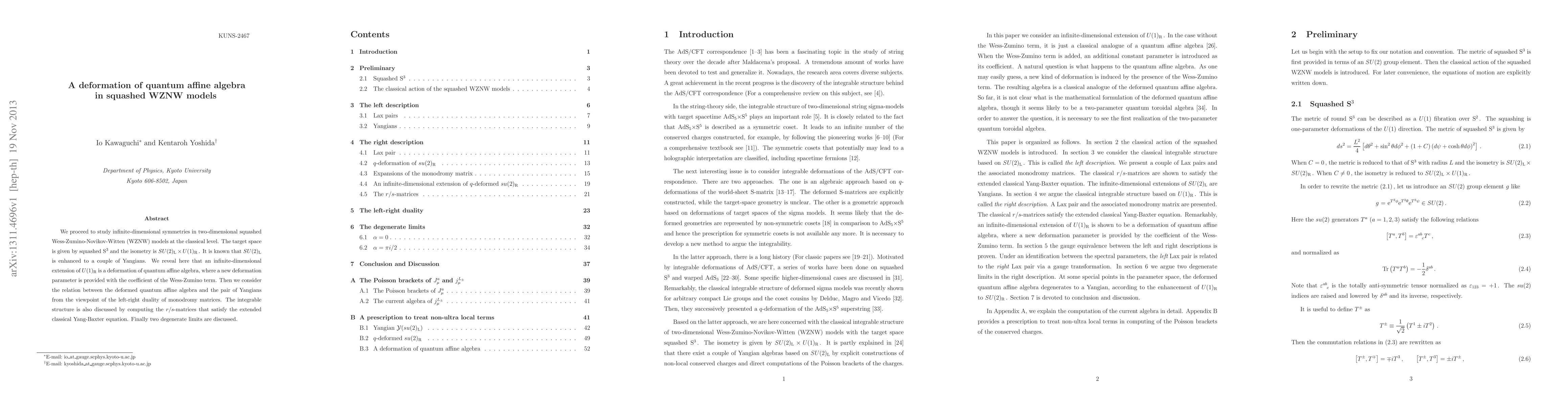 This paper investigates infinite-dimensional symmetries in squashed WZNW models with target space squashed S^3 and isometry SU(2)_L x U(1)_R, revealing that U(1)_R's extension is a deformation of quantum affine algebra. It also explores the relationship between this deformation and the enhanced Yangians of SU(2)_L through left-right duality and discusses the integrable structure via classical Yang-Baxter equation-satisfying r/s-matrices.