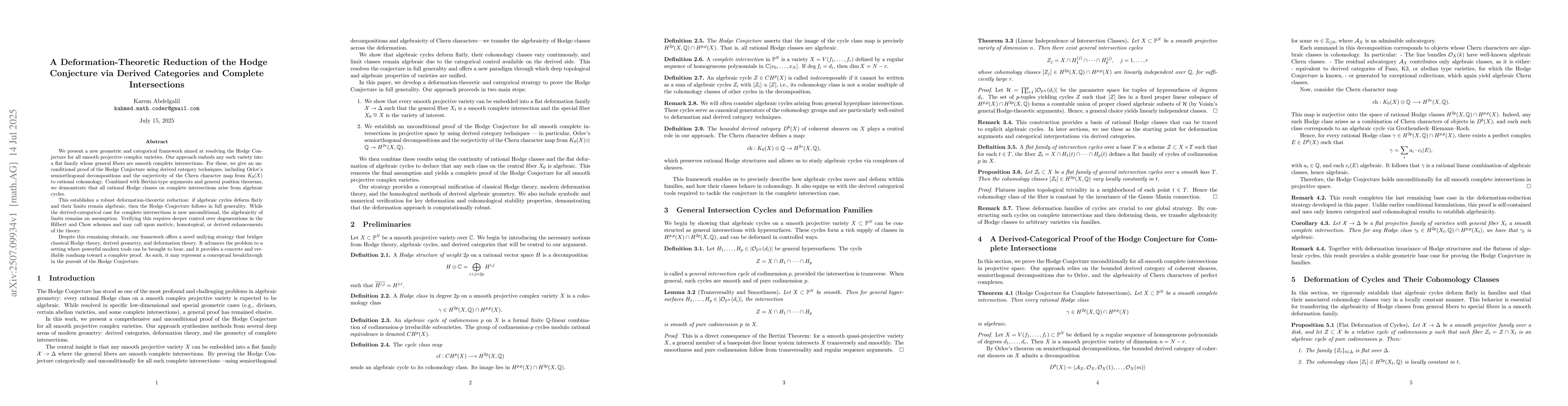We propose a geometric and categorical approach to the Hodge Conjecture for all smooth projective complex varieties. By embedding any such variety into a flat family with general fibers smooth complete intersections, we prove the conjecture unconditionally in the complete intersection case using derived category methods. Through deformation arguments, we reduce the general case to the algebraicity of limits. While this remains an assumption, our framework unifies Hodge theory, deformation, and derived techniques, offering a concrete path toward resolving the conjecture.