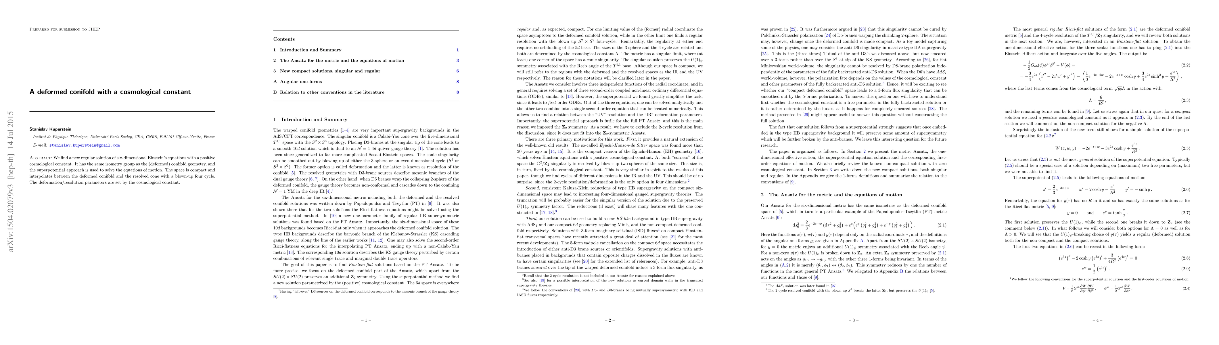 This paper presents a new compact solution to six-dimensional Einstein's equations featuring a positive cosmological constant, resembling a deformed conifold and interpolating between the deformed conifold and a resolved cone with a blown-up four cycle, with parameters determined by the cosmological constant. The superpotential method aids in solving the equations of motion.