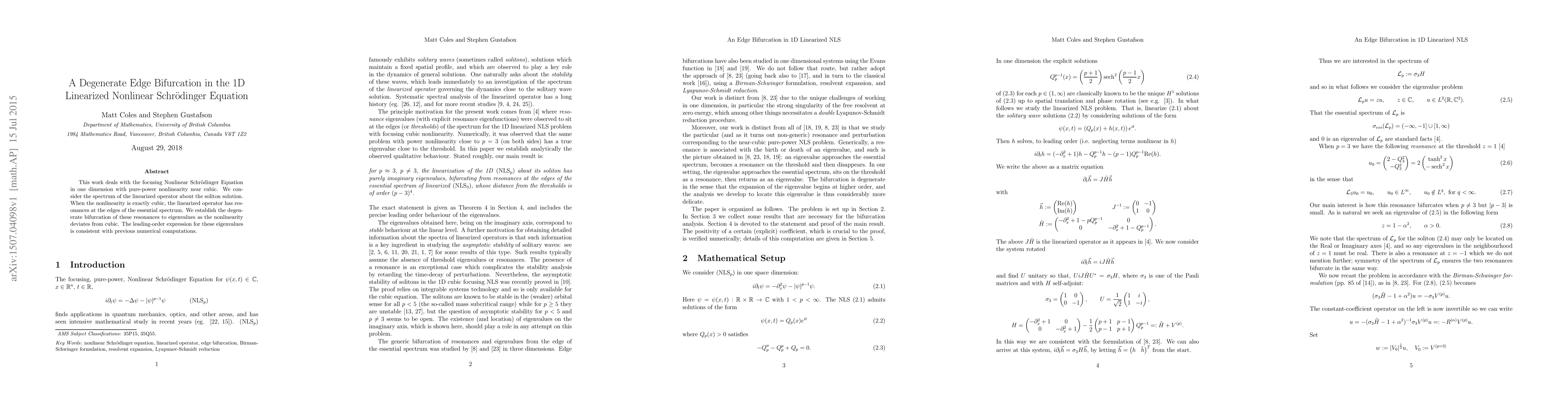 This paper investigates the degenerate edge bifurcation in the 1D linearized Nonlinear Schrödinger Equation with pure-power nonlinearity near cubic. It establishes how resonances transform into eigenvalues as the nonlinearity deviates from cubic, with leading-order expressions matching previous numerical results.