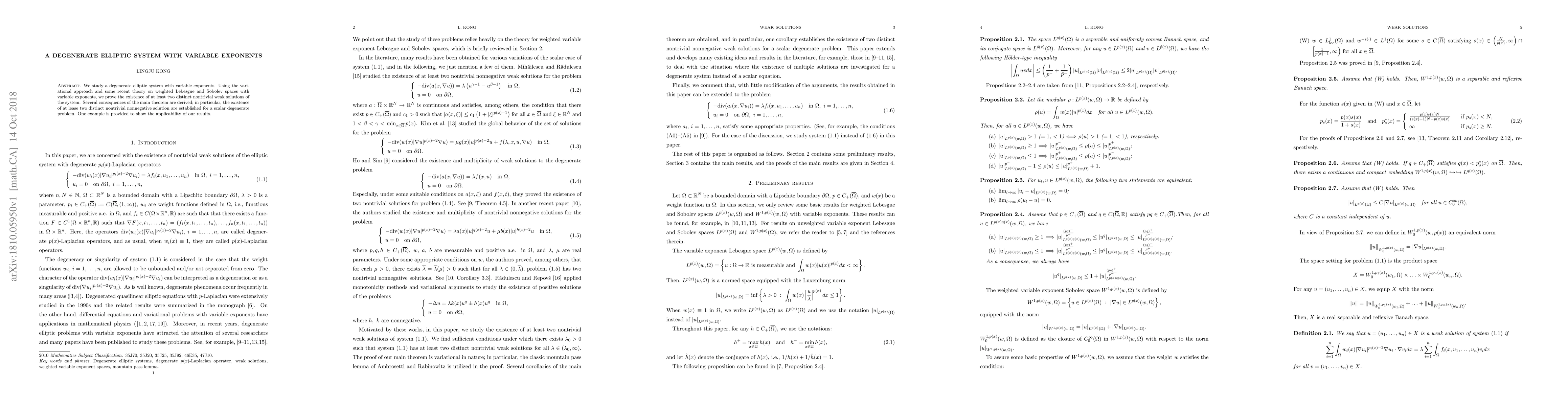 Researchers prove the existence of at least two distinct nontrivial weak solutions to a degenerate elliptic system with variable exponents, with implications for scalar degenerate problems.