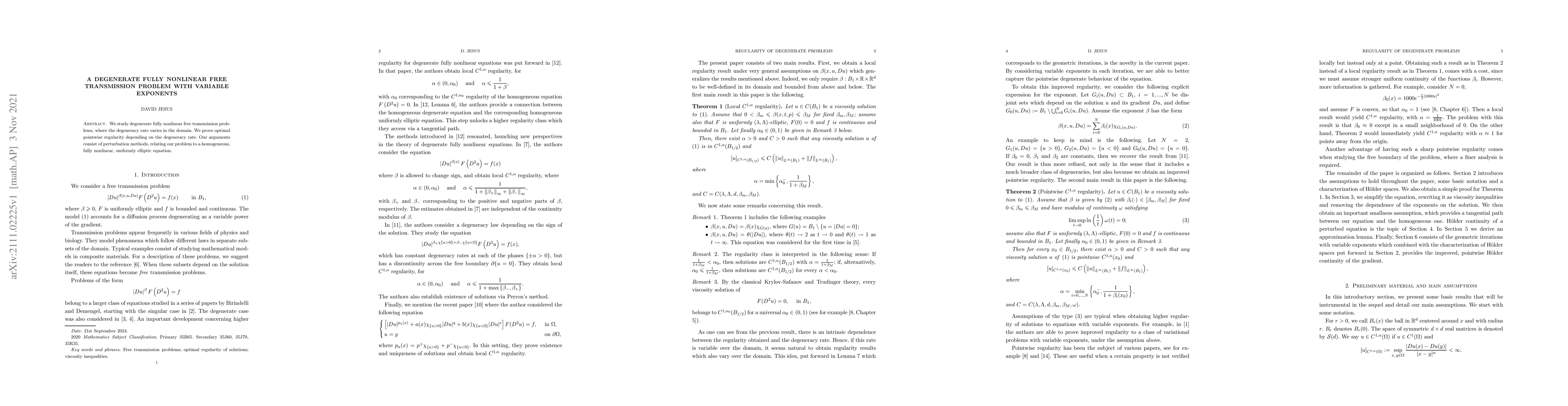 This paper investigates degenerate fully nonlinear free transmission problems with variable degeneracy rates, proving optimal pointwise regularity based on the rate of degeneracy. The authors utilize perturbation methods and relate the problem to a homogeneous, uniformly elliptic equation for their analysis.