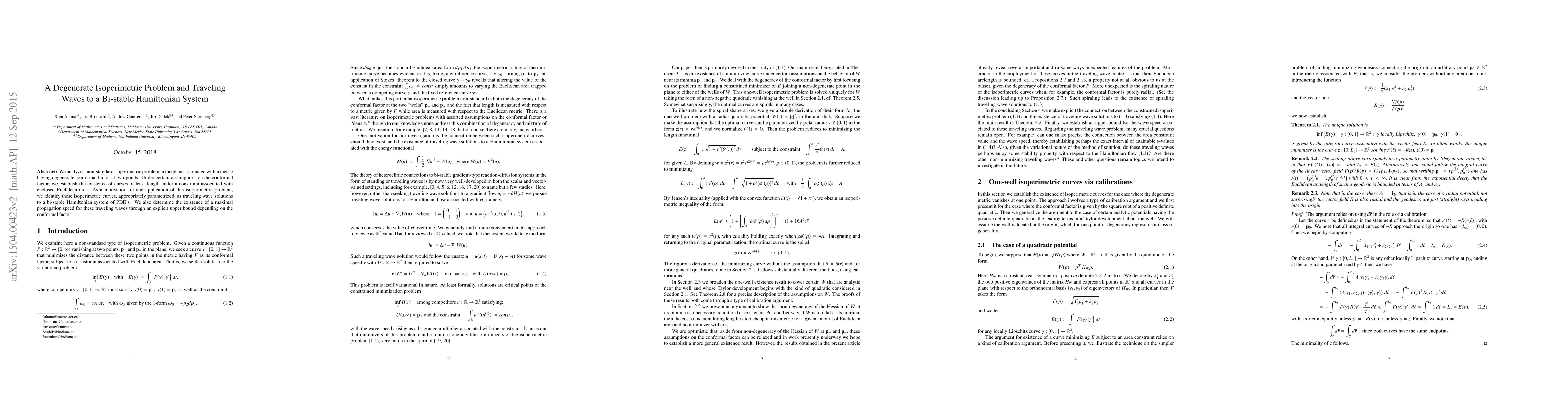 We analyze a non-standard isoperimetric problem in the plane associated with a metric having degenerate conformal factor at two points. Under certain assumptions on the conformal factor, we establish the existence of curves of least length under a constraint associated with enclosed Euclidean area. As a motivation for and application of this isoperimetric problem, we identify these isoperimetric curves, appropriately parametrized, as traveling wave solutions to a bi-stable Hamiltonian system of PDE's. We also determine the existence of a maximal propagation speed for these traveling waves through an explicit upper bound depending on the conformal factor.