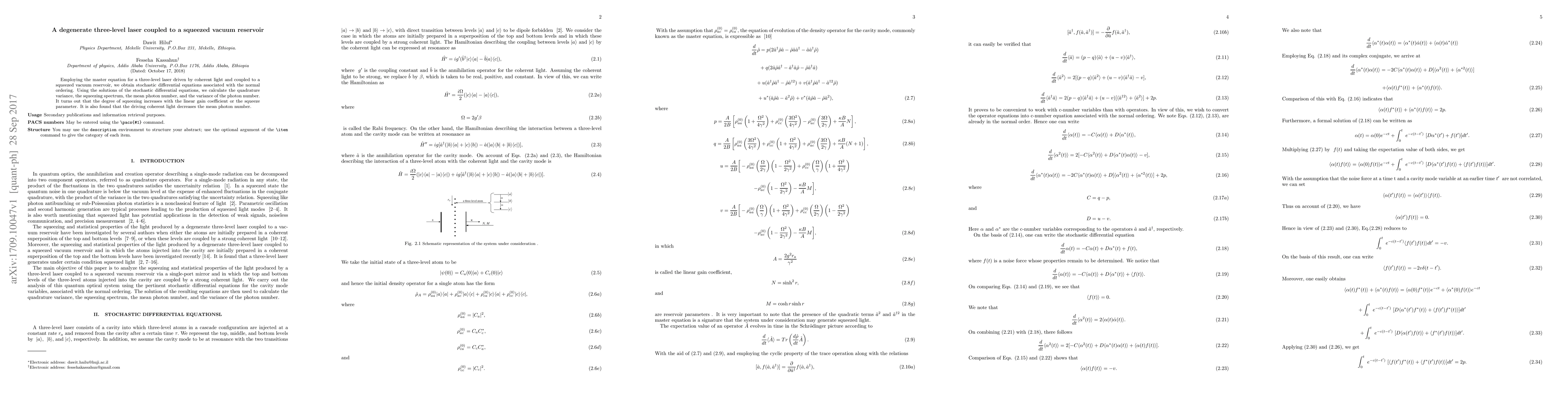 This paper investigates a degenerate three-level laser system interacting with a squeezed vacuum reservoir, deriving stochastic differential equations to analyze its dynamics. The study finds that squeezing increases with gain or squeeze parameters, while the mean photon number decreases with coherent driving light.