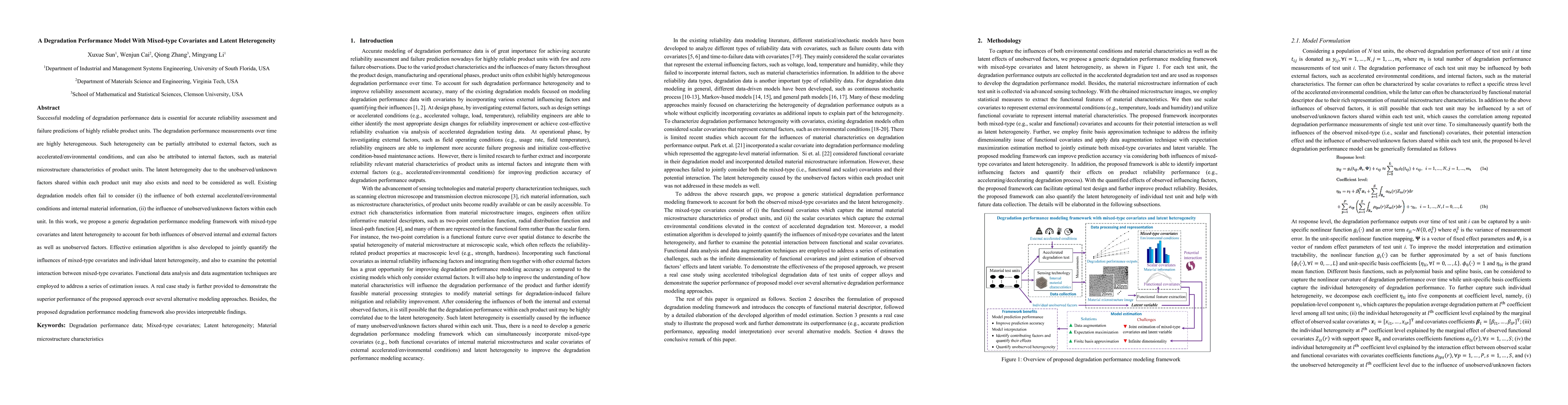 Successful modeling of degradation performance data is essential for accurate reliability assessment and failure predictions of highly reliable product units. The degradation performance measurements over time are highly heterogeneous. Such heterogeneity can be partially attributed to external factors, such as accelerated/environmental conditions, and can also be attributed to internal factors, such as material microstructure characteristics of product units. The latent heterogeneity due to the unobserved/unknown factors shared within each product unit may also exists and need to be considered as well. Existing degradation models often fail to consider (i) the influence of both external accelerated/environmental conditions and internal material information, (ii) the influence of unobserved/unknown factors within each unit. In this work, we propose a generic degradation performance modeling framework with mixed-type covariates and latent heterogeneity to account for both influences of observed internal and external factors as well as unobserved factors. Effective estimation algorithm is also developed to jointly quantify the influences of mixed-type covariates and individual latent heterogeneity, and also to examine the potential interaction between mixed-type covariates. Functional data analysis and data augmentation techniques are employed to address a series of estimation issues. A real case study is further provided to demonstrate the superior performance of the proposed approach over several alternative modeling approaches. Besides, the proposed degradation performance modeling framework also provides interpretable findings.