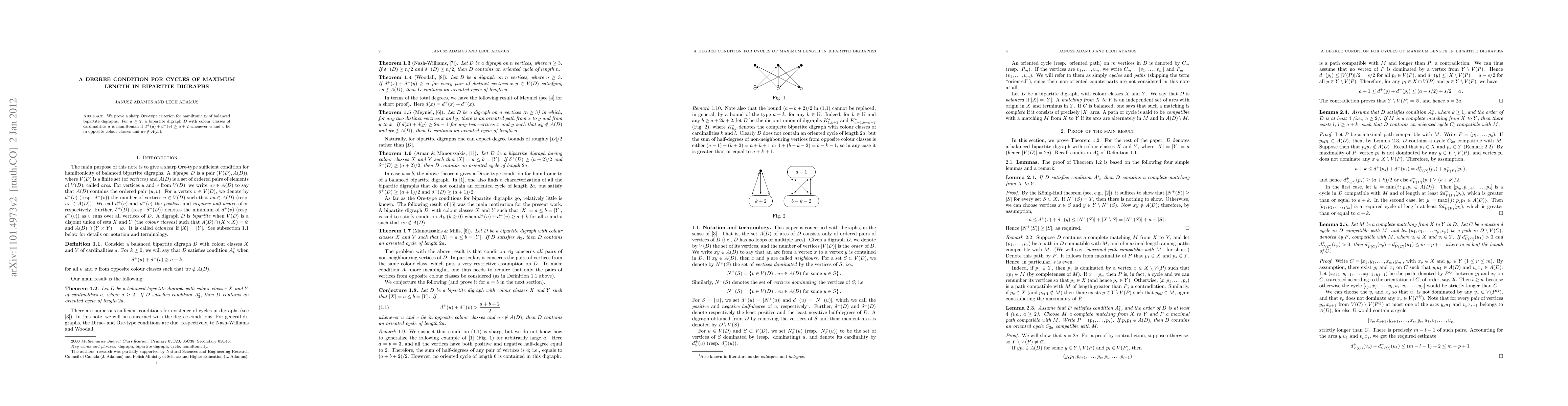 This paper establishes a precise Ore-type condition for the existence of a Hamiltonian cycle in balanced bipartite digraphs, asserting that such a cycle exists if the outdegree of one vertex and the indegree of its opposite-class counterpart meet a specific threshold relative to the graph's size.