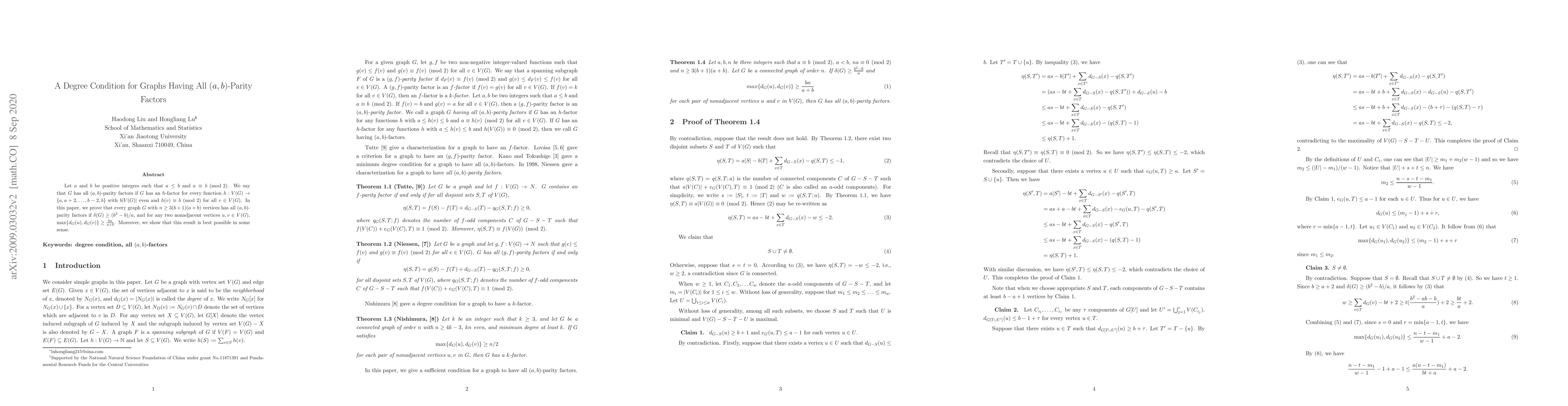 This paper establishes a degree condition for graphs to have all $(a,b)$-parity factors, proving that if a graph meets certain vertex count and minimum degree requirements, it will possess these factors. The result is shown to be optimal in specific cases.